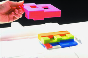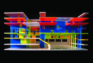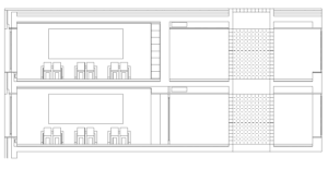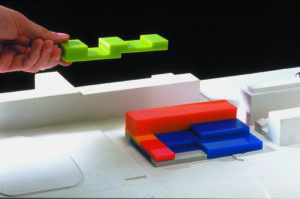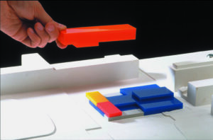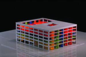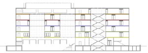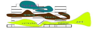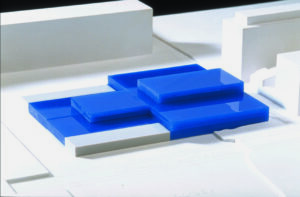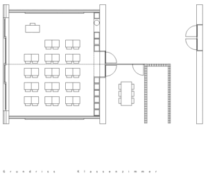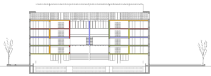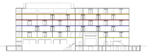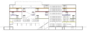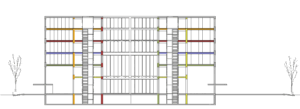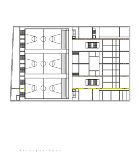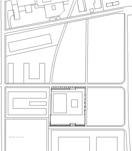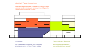 Die ganze Schulanlage ist in einem Gebäudevolumen auf dem Baufeld B5 konzentriert. Das Projekt hält sich eng an die ‚Richtlinien Zentrum Zürich Nord‘, indem die Ecken und Ränder des Baufeldes voll besetzt sind und so der Strassenraum ringsum definiert wird. Der Über- gang vom ‚Örliker-‚ zum ‚Friedrich Traugott Wahlen-Park‘ wird dank der Gebäudehöhe des neuen Schulhauses als kontinuierlicher, urbaner Freiraum gelesen. Die Räume der Primar- und der Ober- stufe sowie ihre jeweiligen Pausen- flächen und Erschliessungen sind räumlich konsequent voneinander getrennt. Die Schüler und Schülerin- nen haben aber im ganzen Gebäude immer wieder visuellen Kontakt. Im mittleren Teil der dreischichtigen Anlage – von beiden ‚Schulen‘ zugänglich – sind die unter Aufsicht gemeinsam genutzten Räume wie Mensa und Forum angeordnet. Indem die Primar- und Oberstufe in einem Gebäude konzentriert sind, werden die sozialen Beziehungen der Kinder und auch der Unter- richtenden gefördert. Unterricht und Erfahrungsaustausch sollen in der modernen Schulpädagogik nicht nur im Klassenzimmer stattfinden.