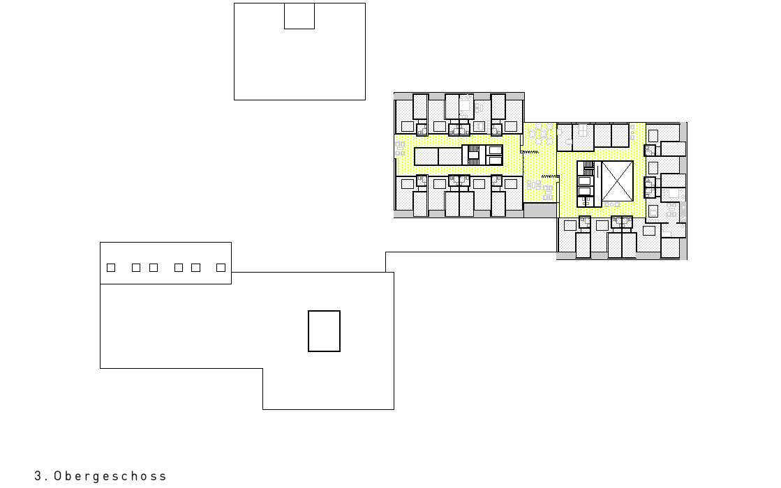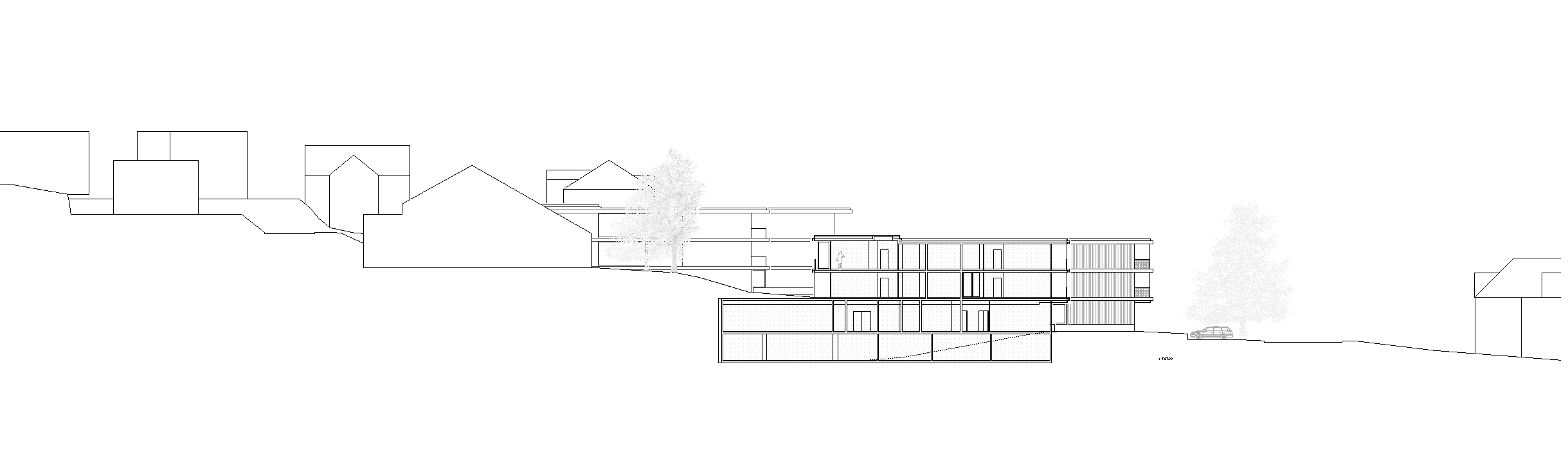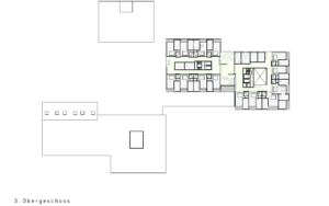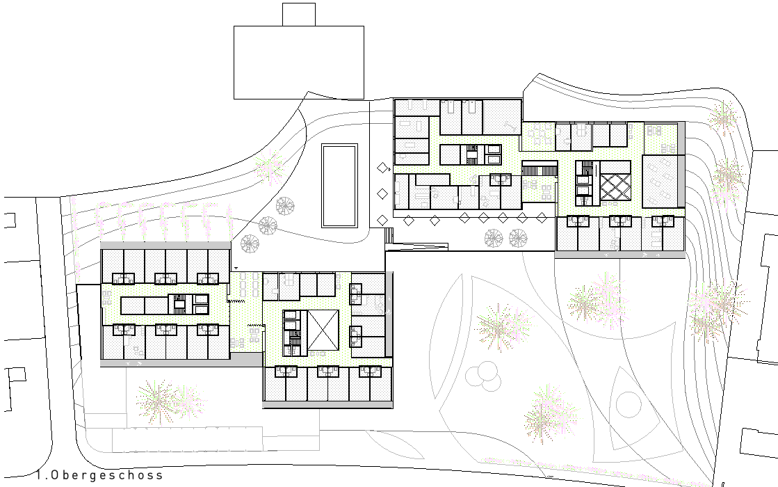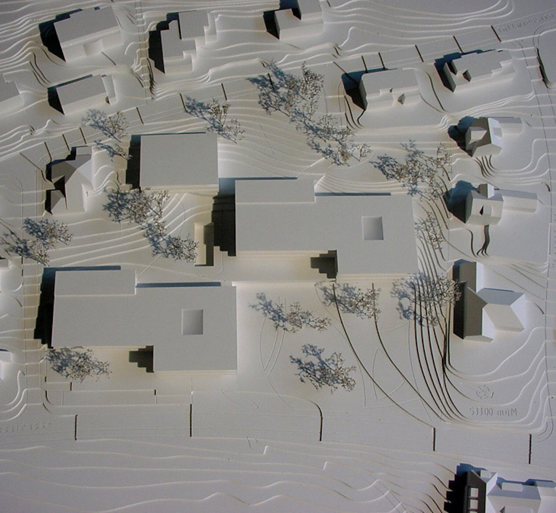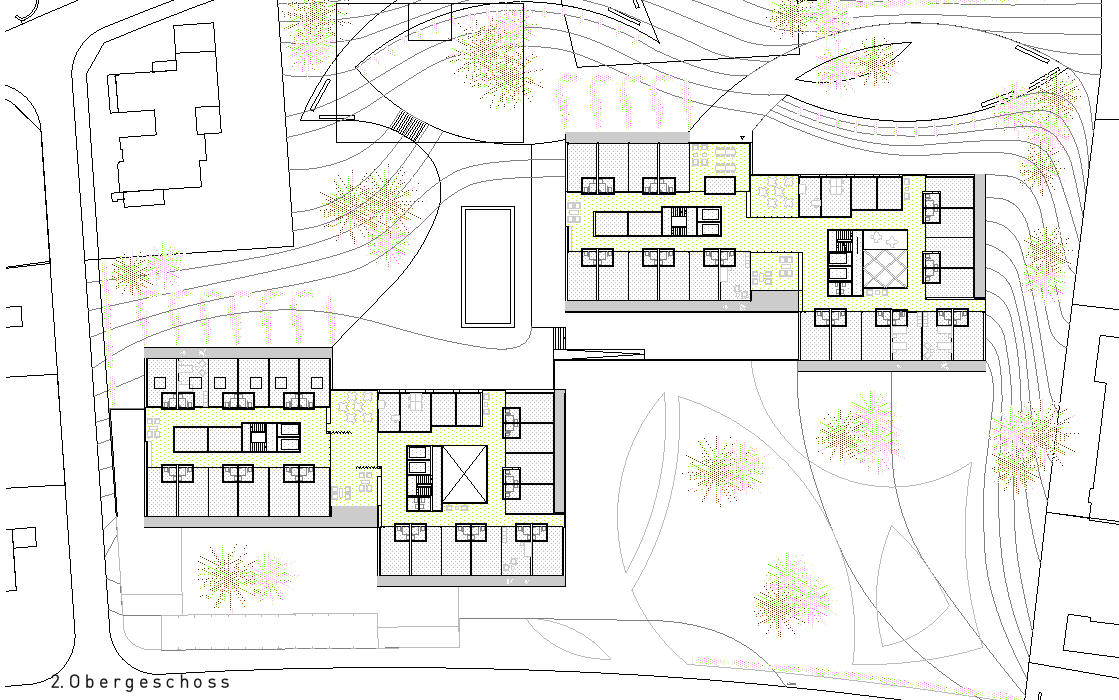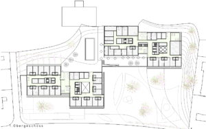 Der in der Höhe differenzierte, mehrfach gestaffelte und geschichtete Baukörper wird in der Länge des Grundstückes entwickelt und stärkt die städtebauliche Struktur gegenüber der Freifläche. Das neue Alters- und Pflegezentrum bettet sich in den Hang ein und nimmt über die bewusst niedrig gehaltenen Traufhöhen und Rücksprünge einen Dialog zu der kleinteiligen und sehr körnigen Quartierbebauung auf.