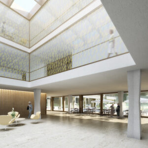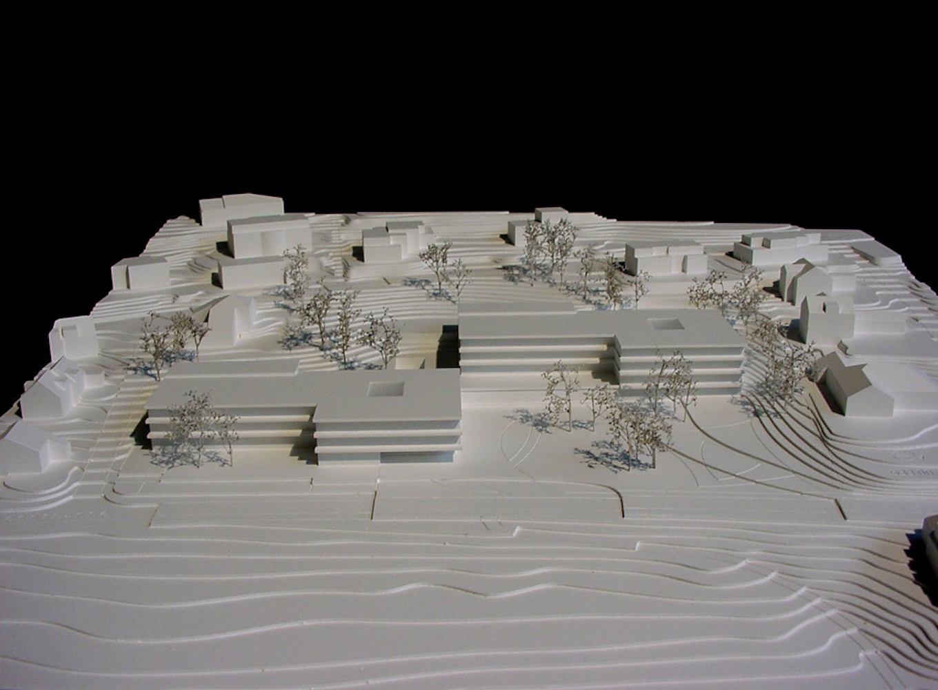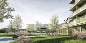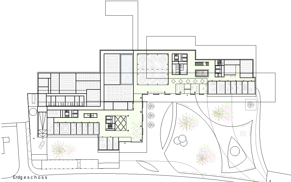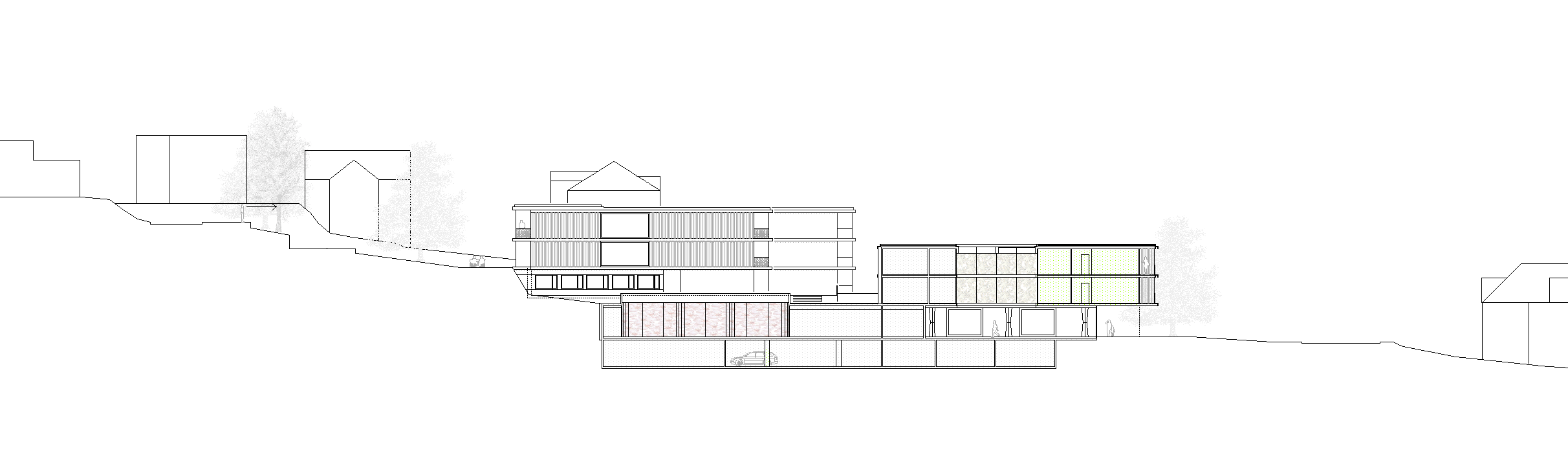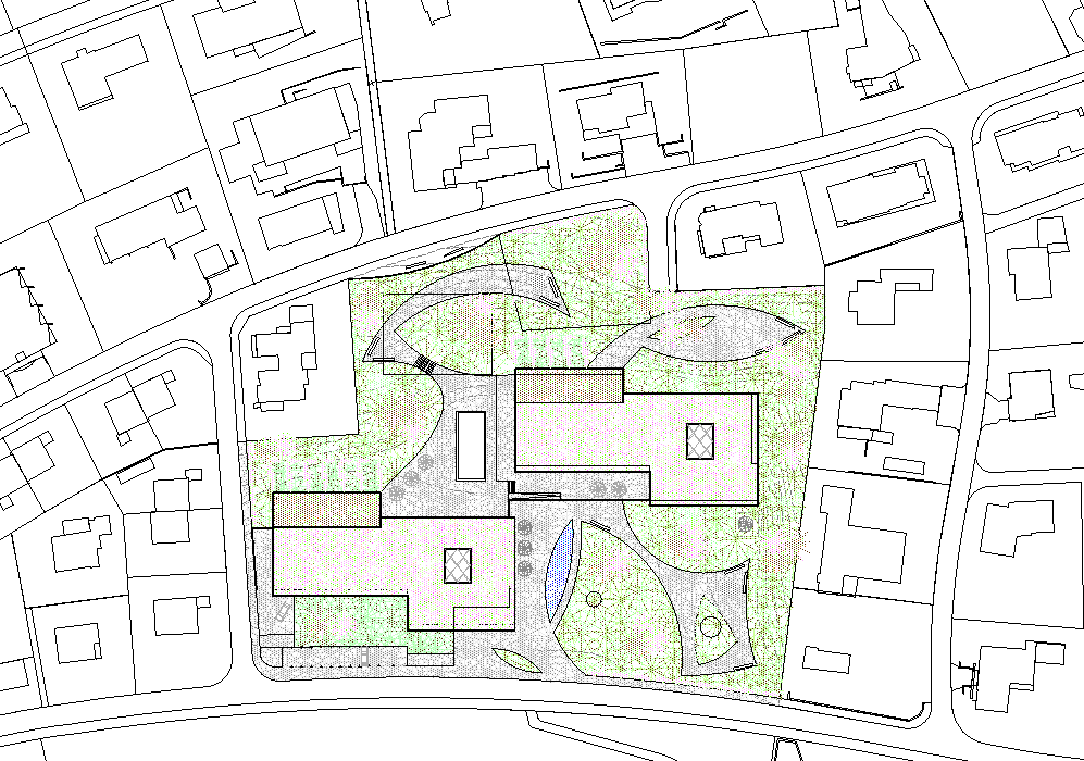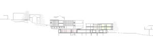 Der in der Höhe differenzierte, mehrfach gestaffelte und geschichtete Baukörper wird in der Länge des Grundstückes entwickelt und stärkt die städtebauliche Struktur gegenüber der Freifläche. Das neue Alters- und Pflegezentrum bettet sich in den Hang ein und nimmt über die bewusst niedrig gehaltenen Traufhöhen und Rücksprünge einen Dialog zu der kleinteiligen und sehr körnigen Quartierbebauung auf.