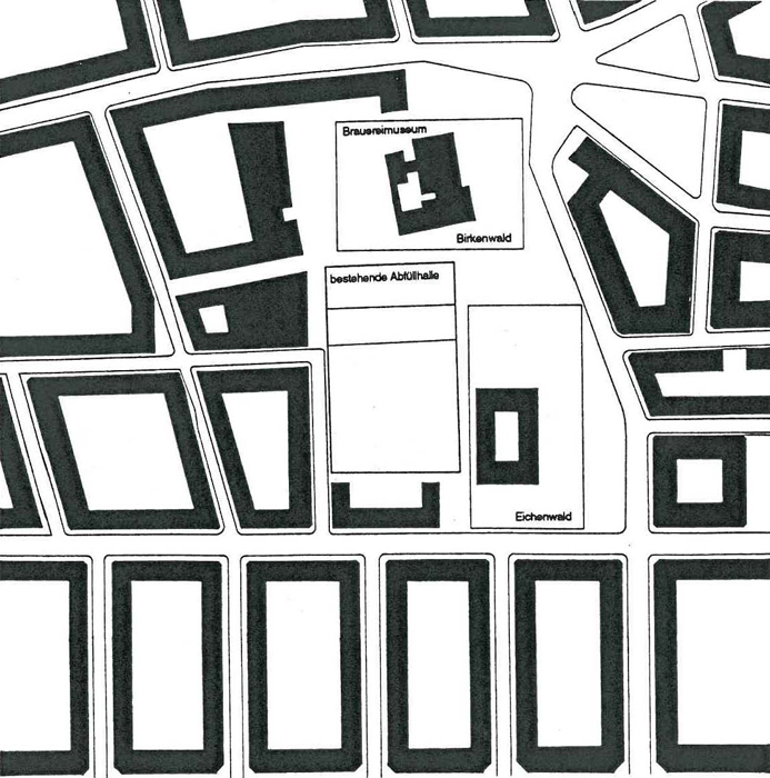 Das Brauereiareal liegt im Zentrum des Bezirks Ottakring, zwischen dem Lerchenfelder Gürtel und der ehemaligen Vorortlinie, in einem Blockrandgebiet. Ein denkbares Zukunfts-Szenario könnte eine Überbauung des Grundstücks mit einigen weiteren markanten Gebäudekörpern sein. Die bauliche Struktur der vorgeschlagenen Gebäude ist der des Blockrandes verwandt. Sie gliedern das zu einem tragenden Quartierzentrum ergänzte Areal in die städtebauliche Ordnung ein. Jedes Gebäude liegt auf einer, mit einer bestimmten Baumart bepflanzten Grundzelle, so gibt es z.B. einen Eichen- und einen Ulmen- oder Birkenwald. Diese kleinen Grünanlagen bilden zusammen einen Stadtpark als Grundlage des Zentrums. Die Zwischenräume der einzelnen Grünflächen, sind versetzt zu den umliegenden Strassen, deren Fluchten jeweils auf einen der im Zentrum stehenden Körper treffen.