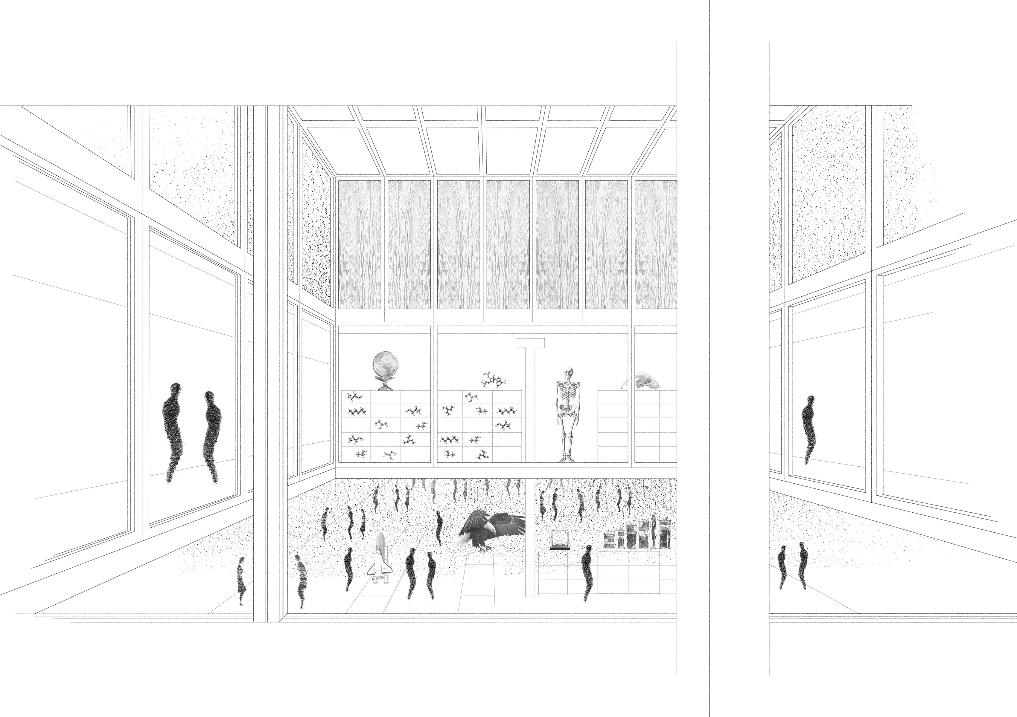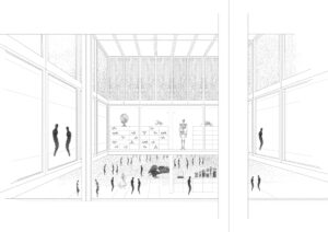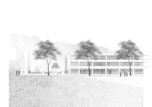 Die architektonische und städtebauliche Idee des neuen MINT–Clusters gründet auf die oben genannten Prinzipien von Fritz Haller. Basierend auf einem 5×5–Meter-Raster fügt sich das neue Gebäude der Kanti Baden zwischen zwei Alleen präzise in den Campus ein und bildet dabei zwei Freiräume in Richtung Norden und Süden. Durch den Abstand zum Gebäude 6 (1976) erhält die Mensa nun einen grosszüzigen Platz, der im Winter gut belichtet und im Sommer von dichten Gleditschien beschattet wird. Trotz der Rückbesinnung auf den Masterplan von Haller besitzt das neue MINT–Gebäude einen eigenständigen Charakter, der von einer Dualität geprägt ist: Massive Betonteile treffen auf filigrane Metallelemente, die gefassten Treppenkerne führen in möglichst transparente Eingangshallen, fixe Bauteile werden mit beweglichen Elementen kombiniert, die Fachschaft Sport trifft auf die wissenschaftlichen Fächer des MINT. Dieses dynamische Wechselspiel von Gegensätzen verleiht dem neuen Gebäude eine spannungsreiche und innovative Ausstrahlung.