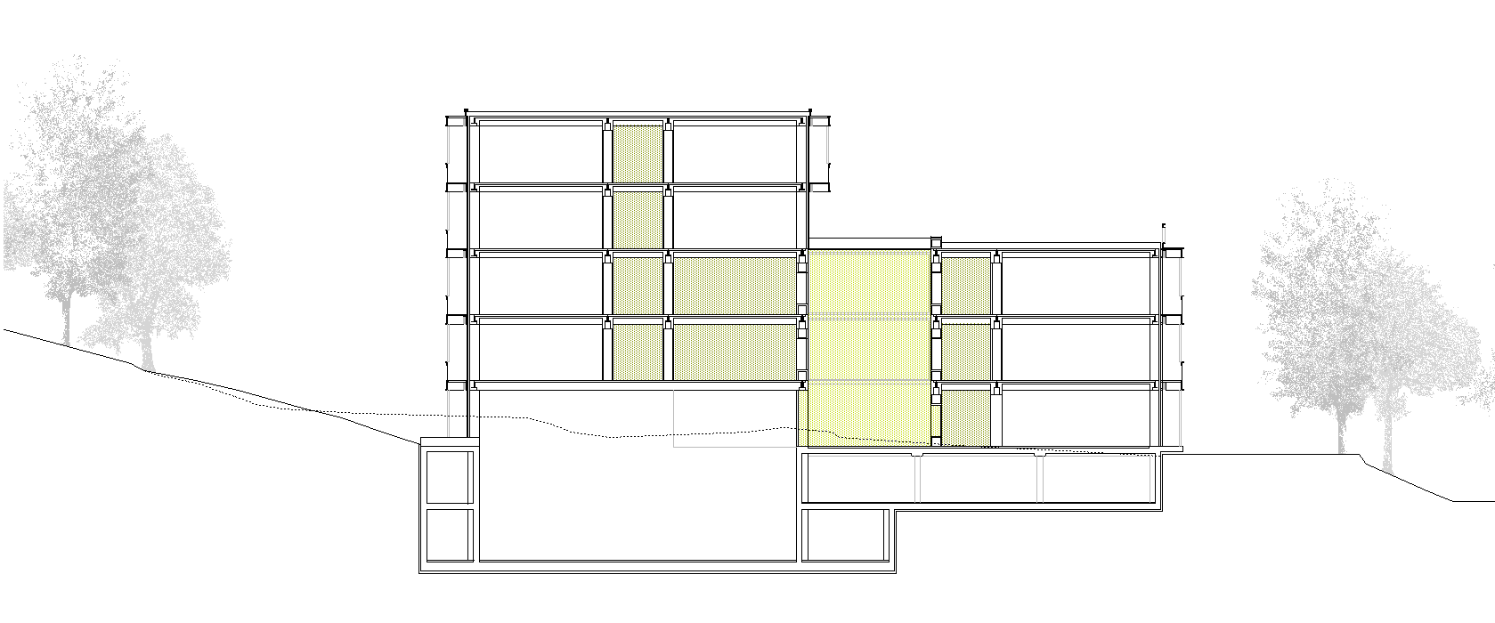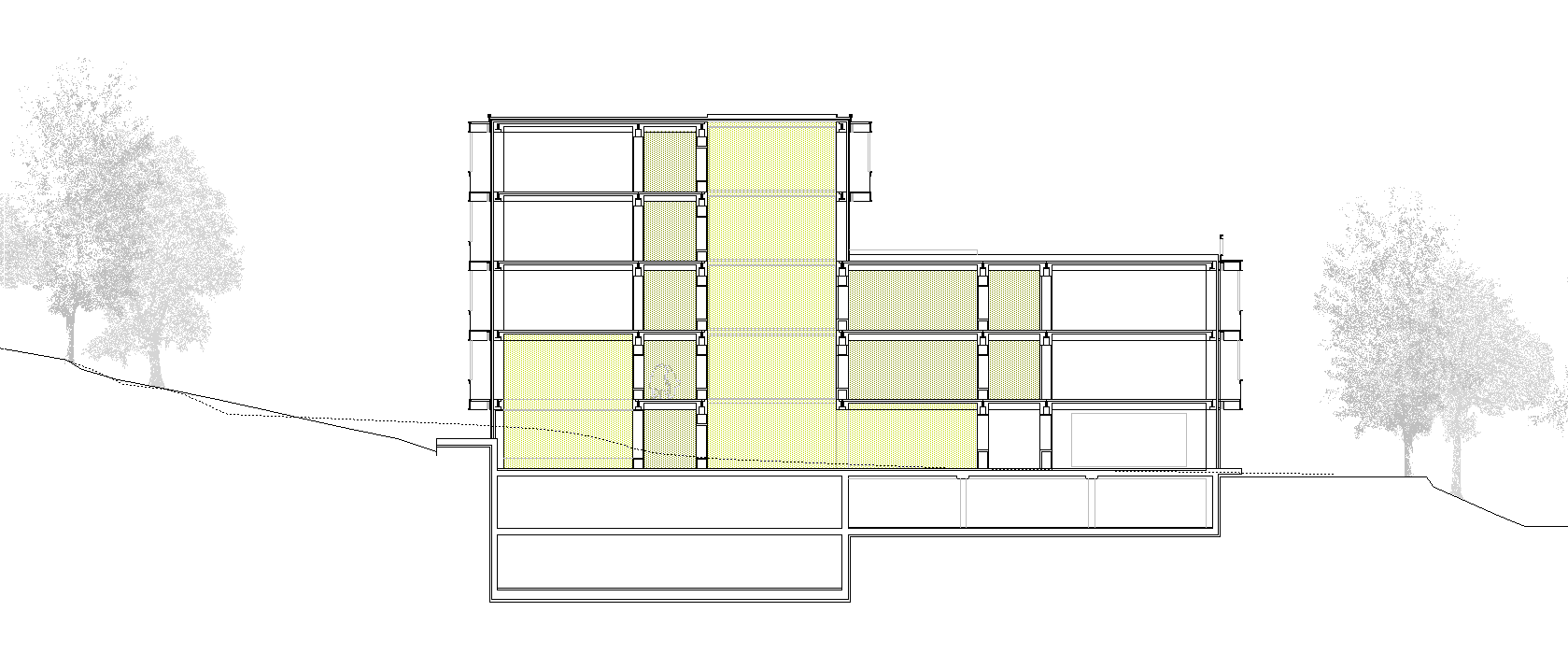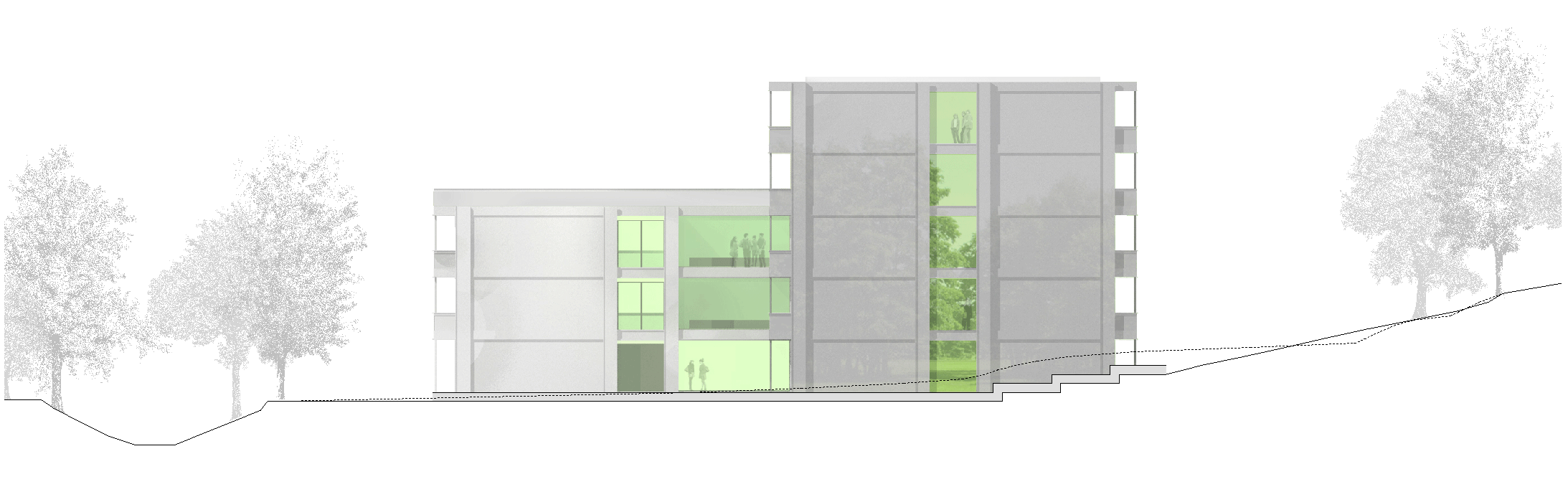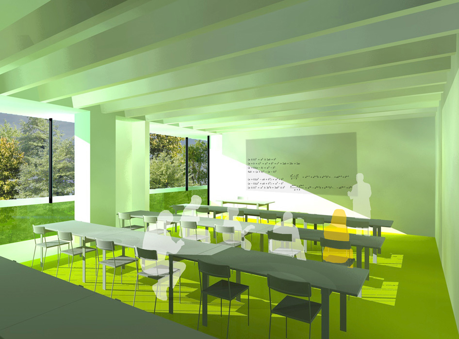 Das Stadtbild von Winterthur ist gleichermassen geprägt vom historischen Stadtkern wie auch von grossmassstäblichen Industriebauten. Das neue Schulgebäude reagiert volumetrisch auf den baulichen Massstab der näheren Umgebung (Wohnsiedlung, Nachbarvilla) und führt den von den Architekten Amsler eingeführten, architektonischen Ansatz zeitgenössisch weiter, u.a. durch die Volumenverschiebung und die Feingliedrigkeit. Mit seinem kubisch gestaffelten Baukörper nimmt das Gebäude die Volumetrie der Industriebauten wie z.B. auf dem Sulzerareal auf.