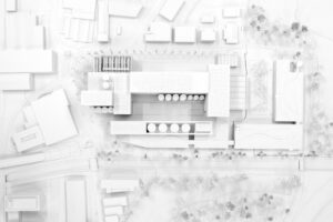 An den Rändern der Anlage sind konsequent nur kleine Volumina platziert, welche den Massstab des angrenzenden Quartiers aufnehmen und zwischen den Dimensionen vermitteln. Das Resultat ist eine gestaffelte Präsenz gegen das Naturschutzgebiet und das Gewerbequartier.