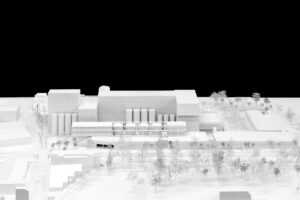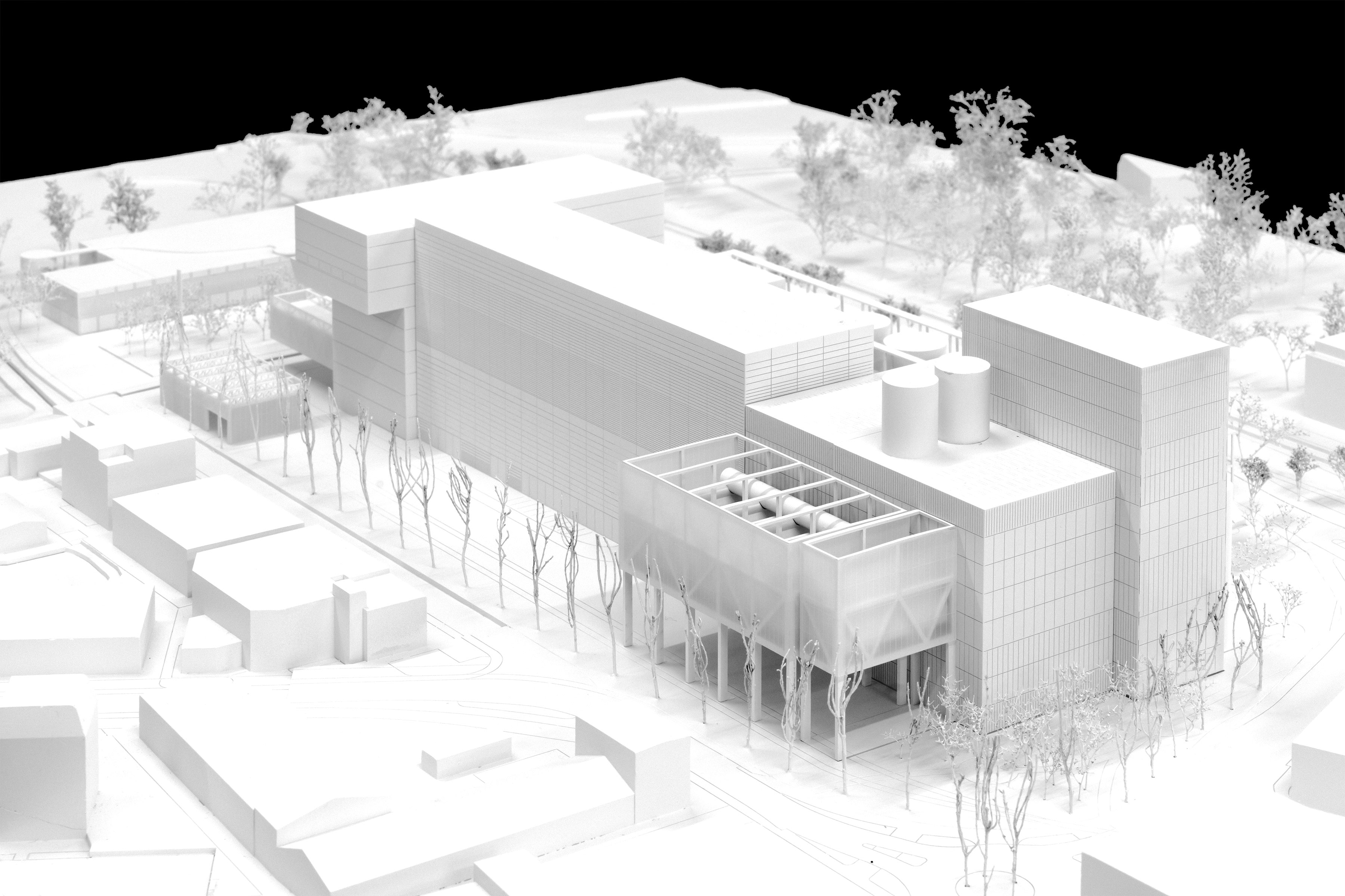 Dies beeinflusst zum einen die Gestaltung des Volumens: Zur Integration der grossen Baumasse der Energiezentrale in die Landschaft sind die Baukörper ihrer Höhe nach gestaffelt, wobei die Höhe konsequent zu den Rändern hin abnimmt. Somit wird die Wahrnehmung aus der unmittelbaren Umgebung als auch die Fernwirkung reduziert.