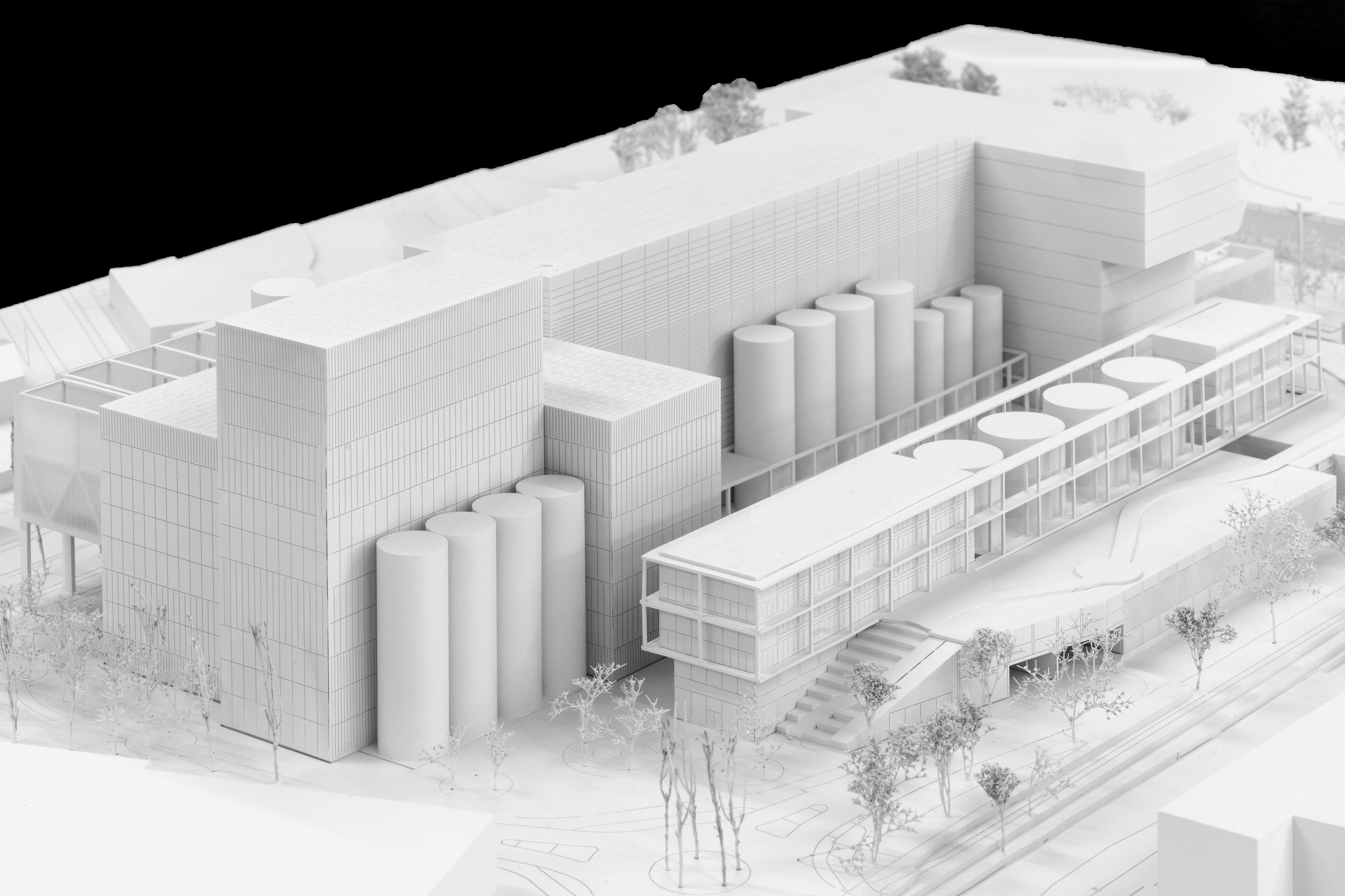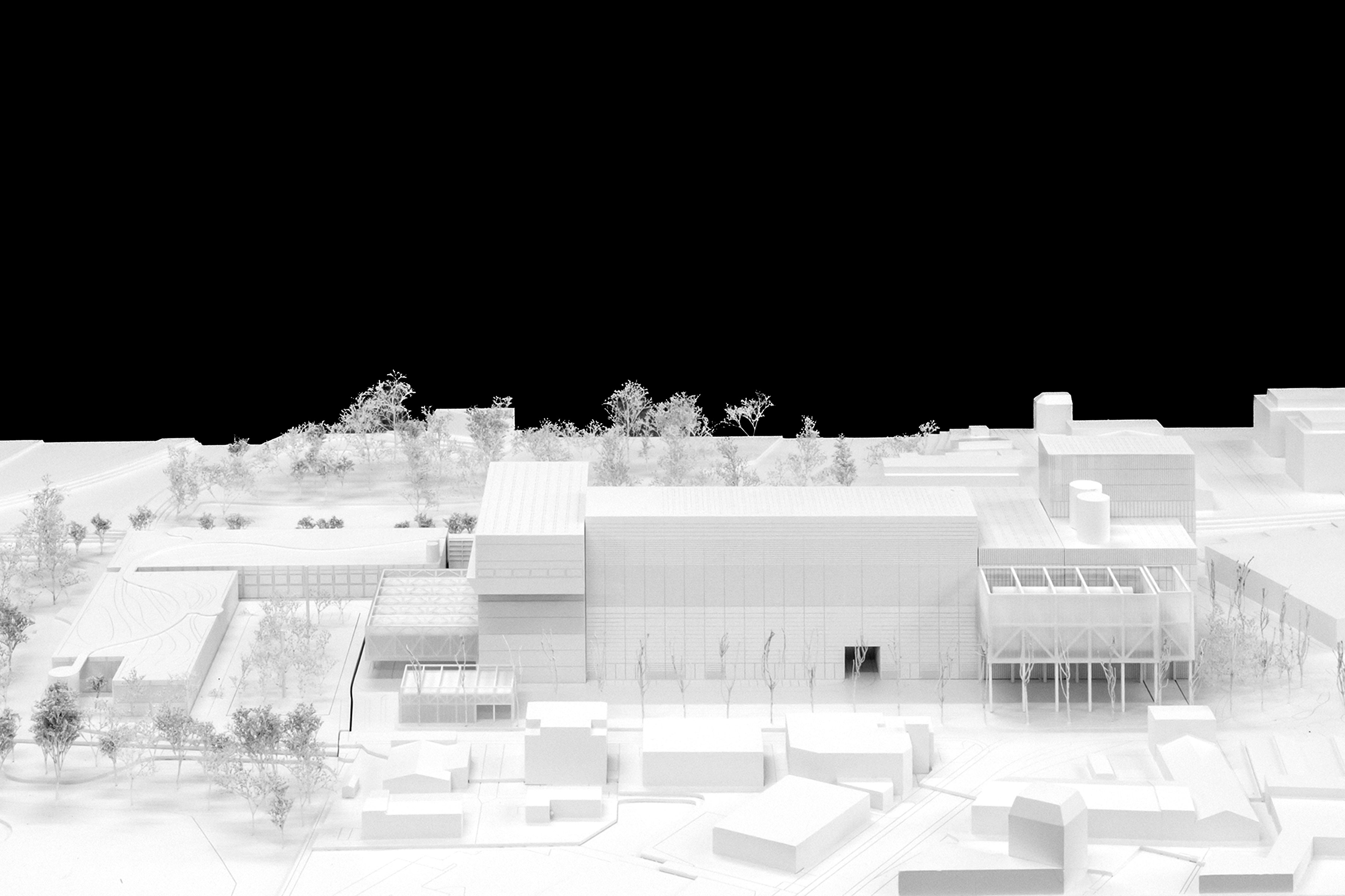 Zum anderen bestimmt die Nähe zum Naturschutzgebiet die Gestaltung der Aussenräume und den Umgang mit Vegetation: Wir schlagen vor, einen dichten, vegetativen Rahmen aus Grünflächen, Büschen und Bäumen, begrünten Fassaden und Dächern rund um das Areal zu legen. Bewusst konzentrieren wir das Grün dort, wo es städtebaulich maximal wirksam ist und auch mit realistischem Aufwand gepflegt werden kann – also nicht an den hohen Fassaden des Prozessgebäudes, wo der Zugang schwierig und die Pflege aufwändig ist, oder an Fassaden, an der in absehbarer Zukunft angebaut werden wird. Stattdessen setzen wir auf Bäume, die auf natürlichem Boden stehen, auf Dächer, welche mit vernünftigem Aufwand gepflegt werden können und auf Fassadenteile des Bunkers, die dauerhaft unverändert bleiben.