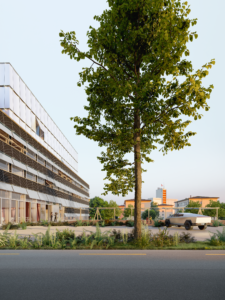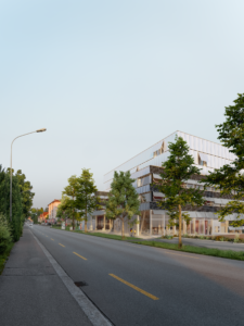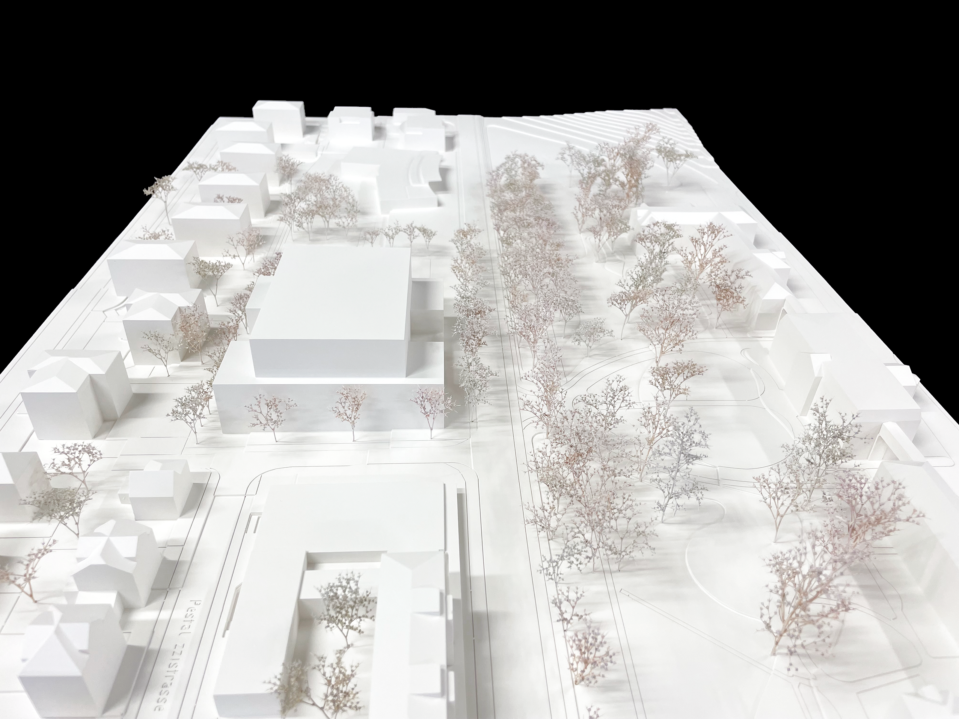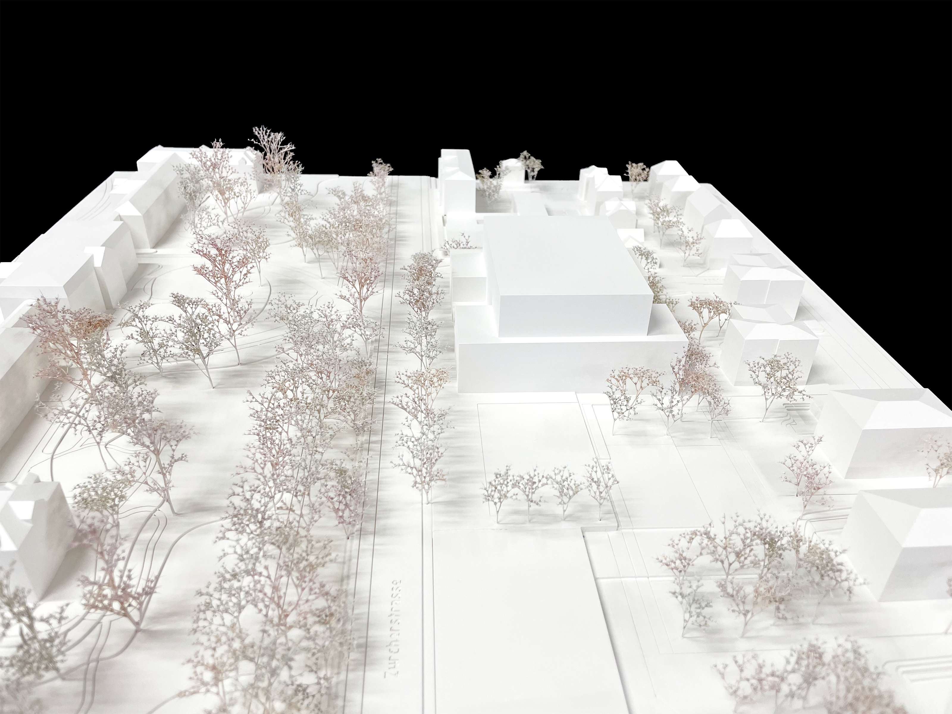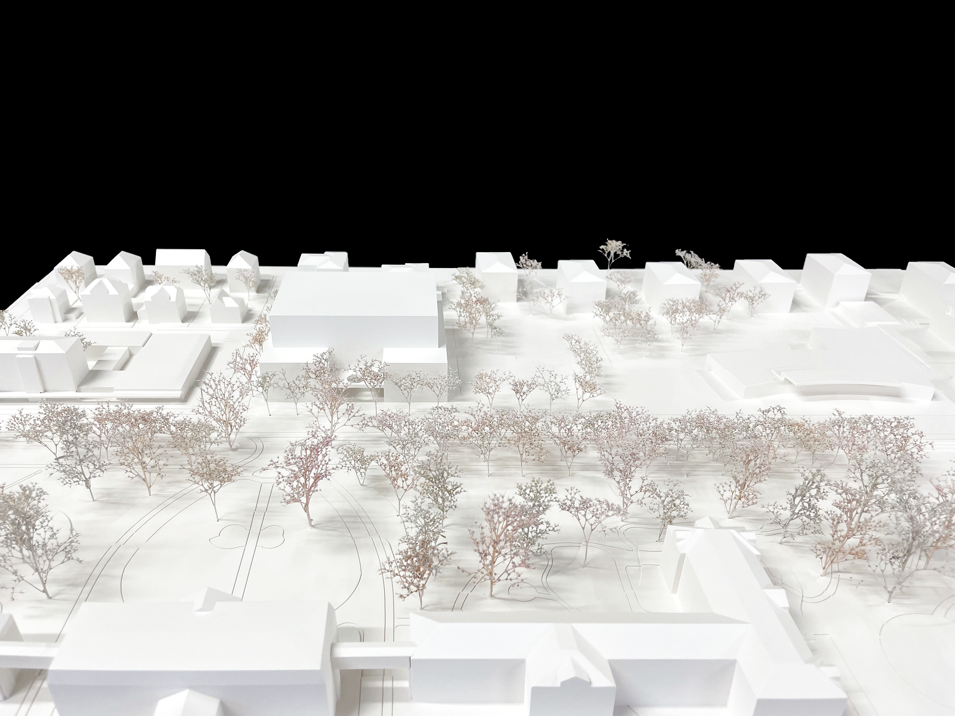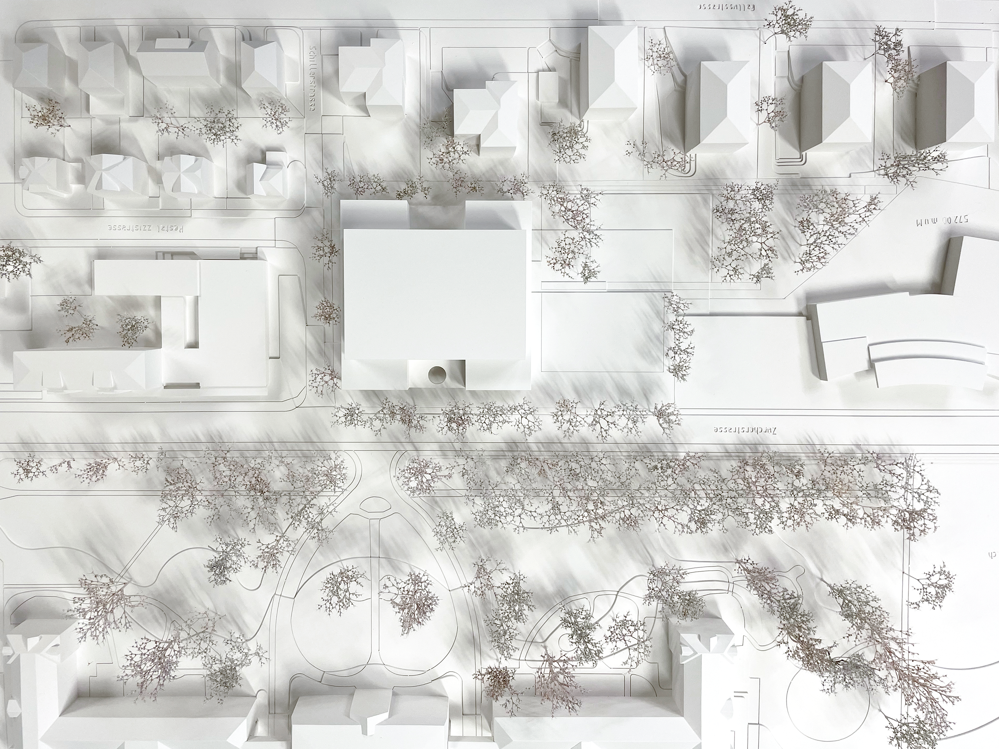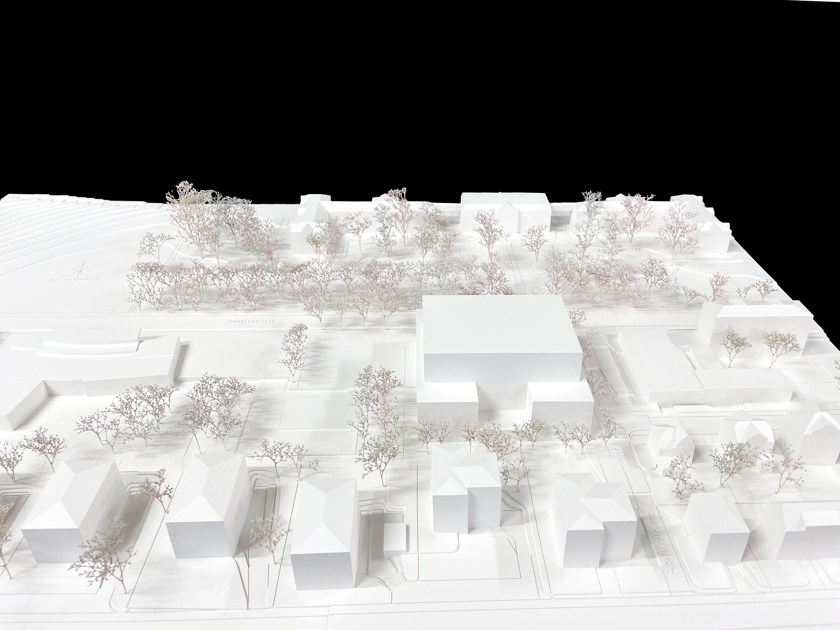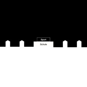 Der Perimeter zeichnet sich dadurch aus, dass er zwei unterschiedliche Zonen umfasst: westlich eine Wohnzone, östlich eine öffentliche Zone. Wir konzentrieren die Schule vollständig auf die öffentliche Zone, wodurch ein grosszügiger Freiraum auf der angrenzenden Wohnzone entsteht. Erst dieser städtebauliche Ansatz bewahrt den weitläufigen Blick vom öffentlichen Psychiatriepark nach Süden bis ins Zentrum der Stadt Wil.