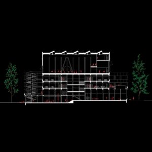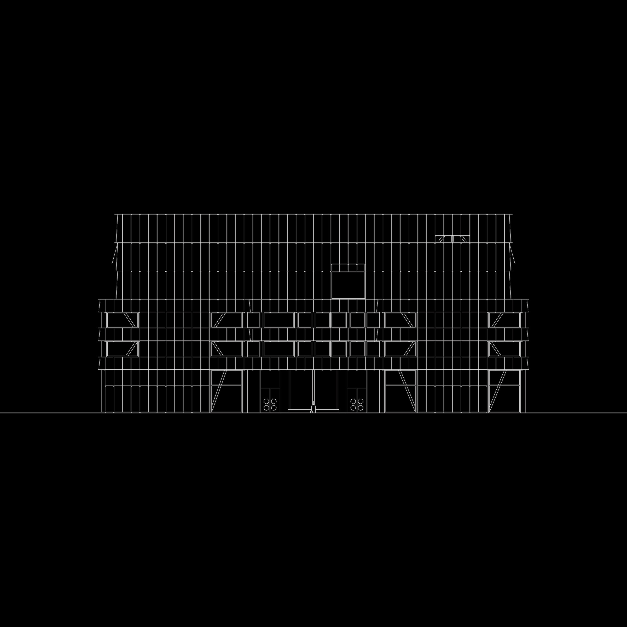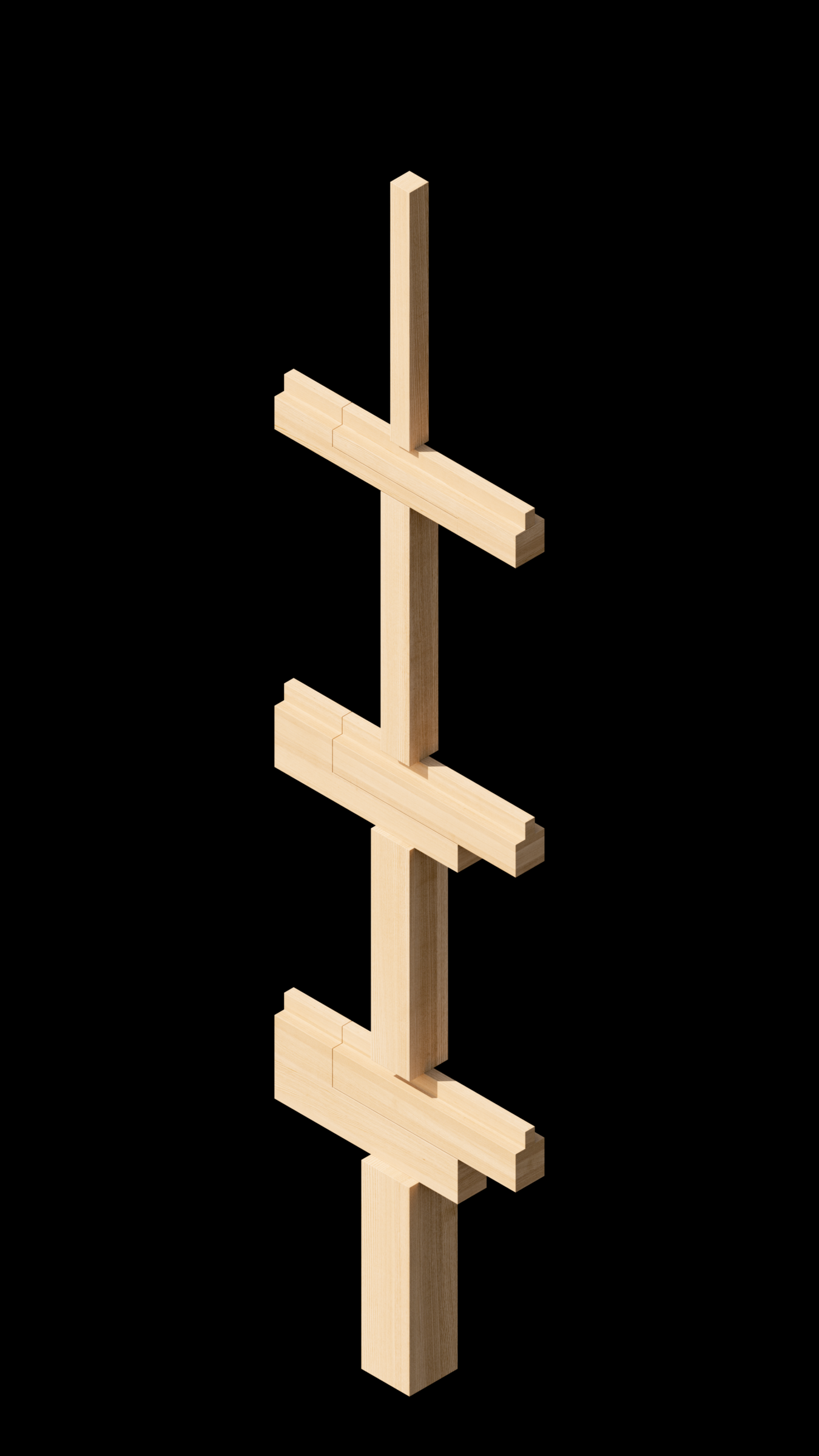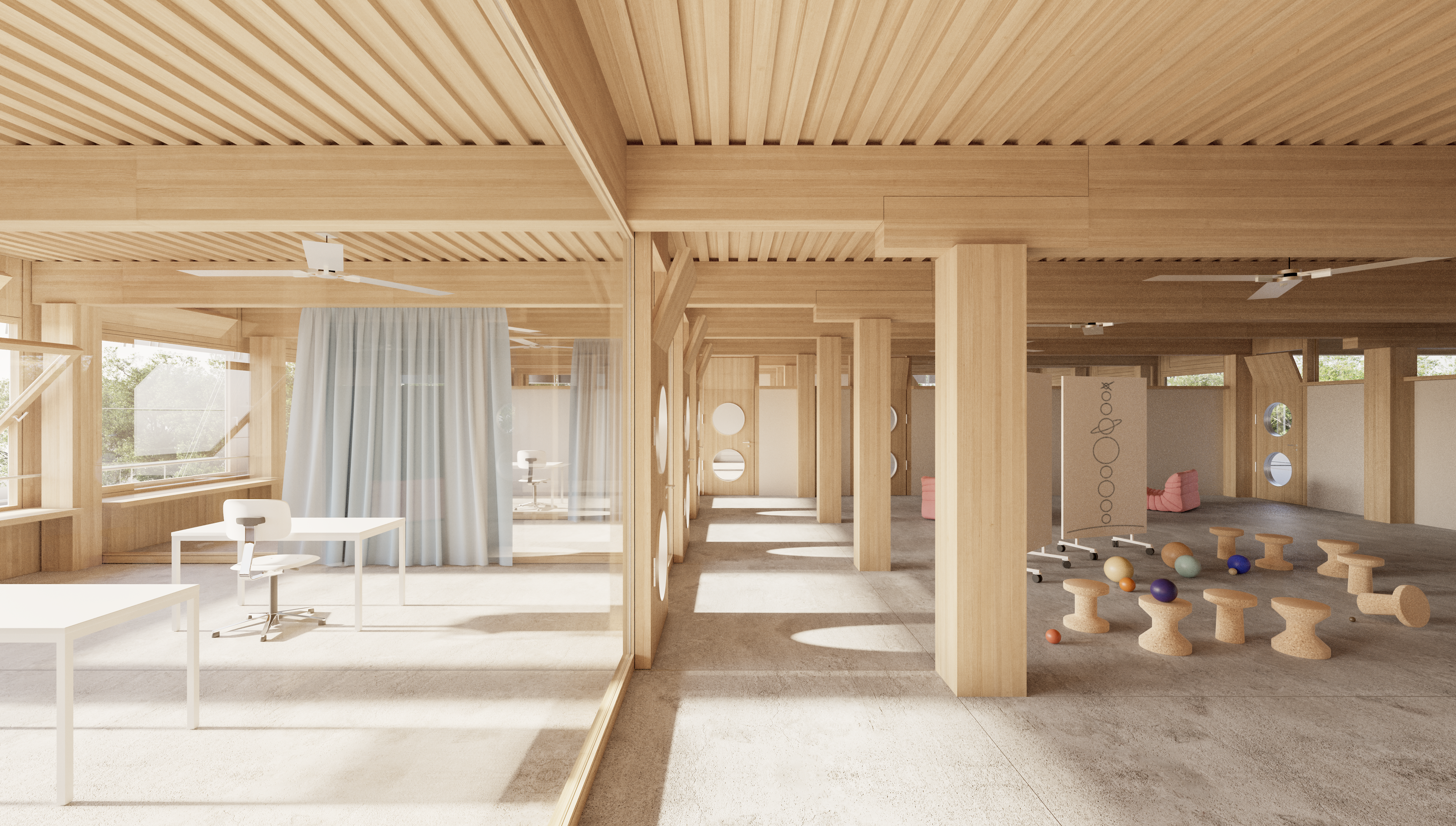 Das Tragwerk der Schule besteht aus Holz und wird so ausgebildet, dass die Lastabtragung nach aussen ablesbar wird. Hierfür sind Stützen und Träger unterschiedlich dimensioniert, so entsteht eine Abstufung von kräftigen zu schlankeren Querschnitten — je nach Last, Lage und Position der Bauteile innerhalb des Gebäudes. Die Aussteifung gegen Wind- und Erdbebenlasten erfolgt ausschliesslich mittels Holzauskreuzungen, die überwiegend in den Fassaden und im Zentrum des Schulhauses angeordnet sind.