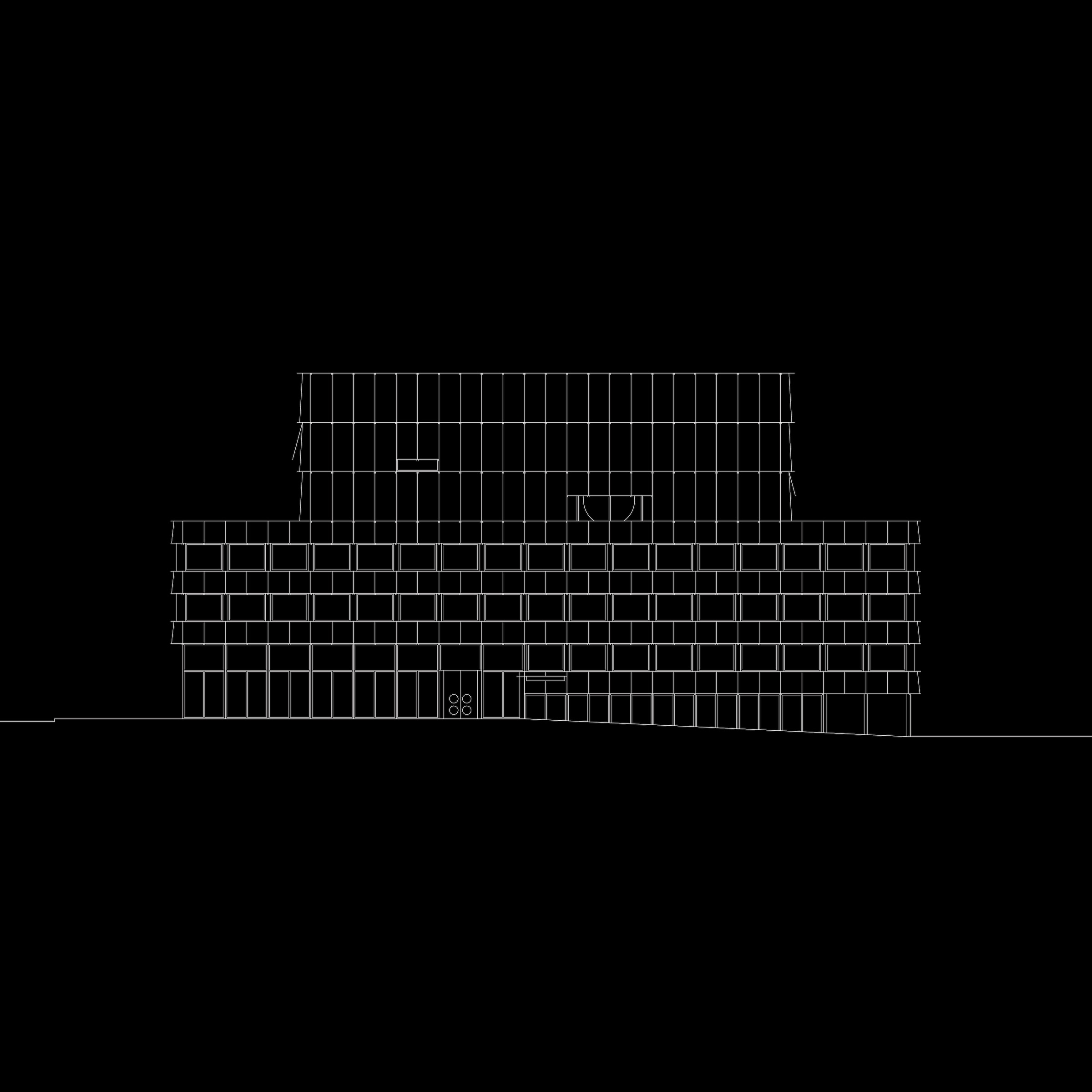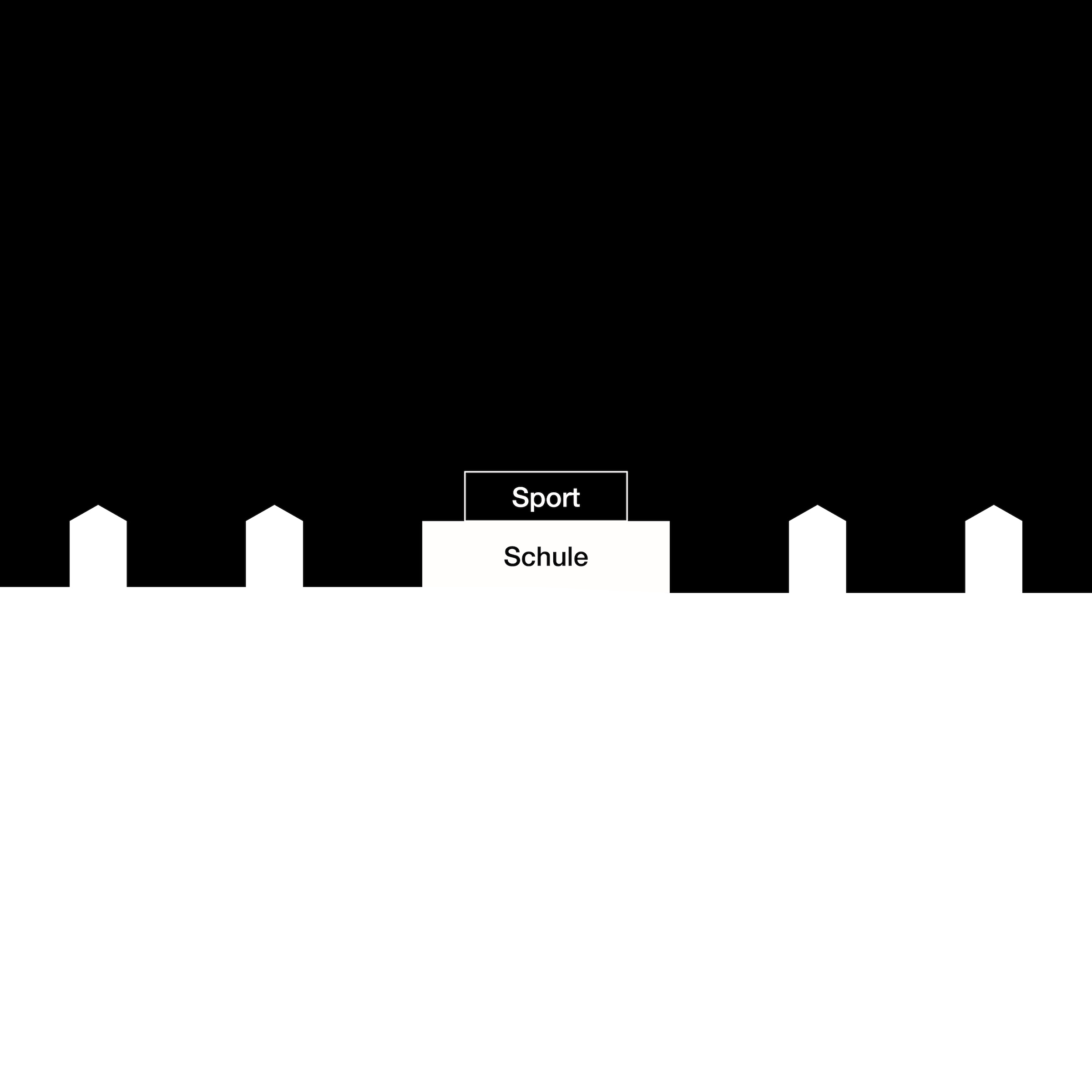 Für die Primarschule Wil schlagen wir einen Sockel vor, der sich in das natürliche Gefälle des Geländes einfügt und deshalb vollständig ohne Untergeschoss auskommt. Achsialsymmetrisch organisiert – wie die Häuser der nördlich angrenzenden Klinik – und in seiner Höhe auf die umliegende Bebauung abgestimmt, bildet er die Grundlage für die Sporthalle. Sichtbar aufgesetzt – nicht im Boden vergraben – setzt sie am westlichen Stadteingang ein starkes architektonisches wie städtebauliches Zeichen.