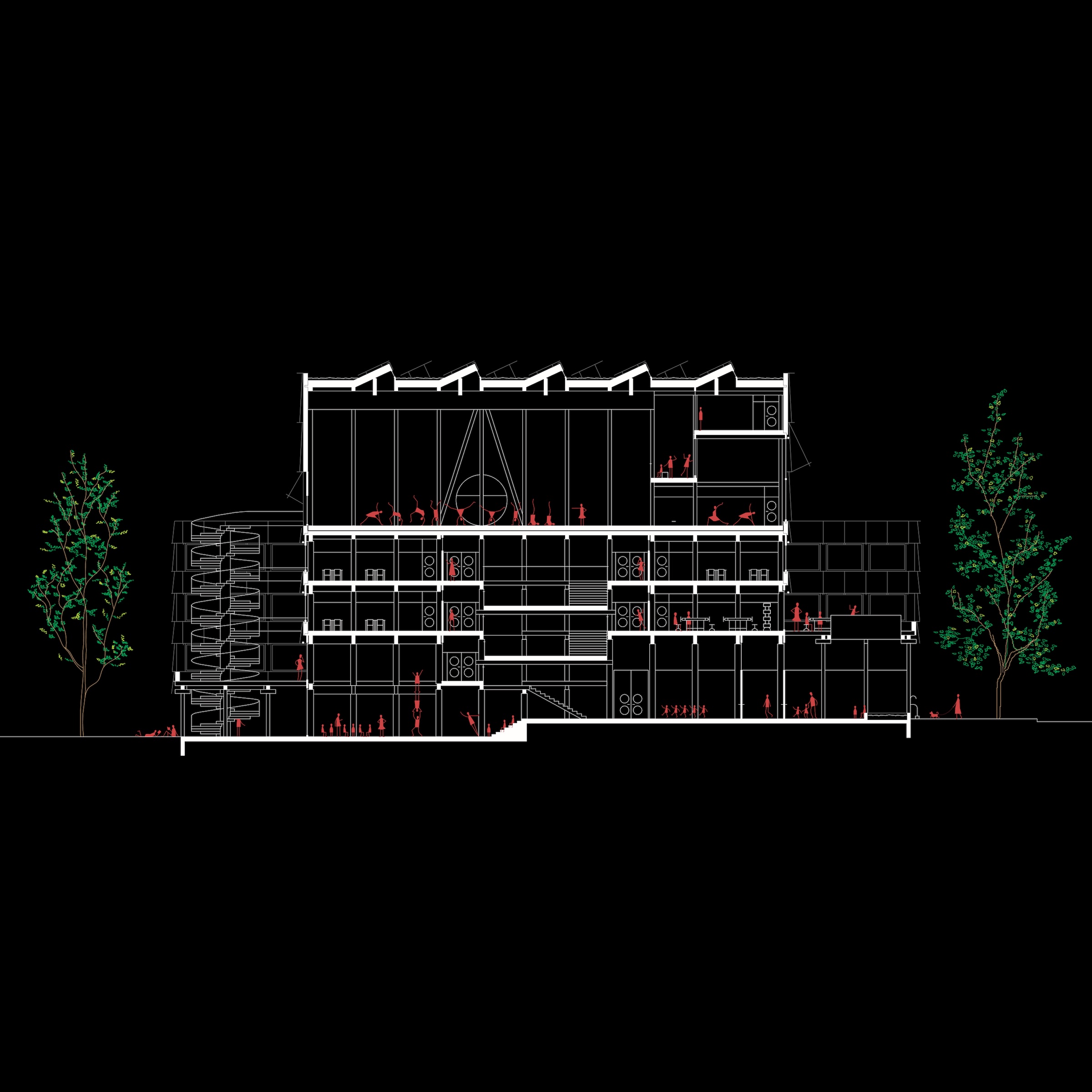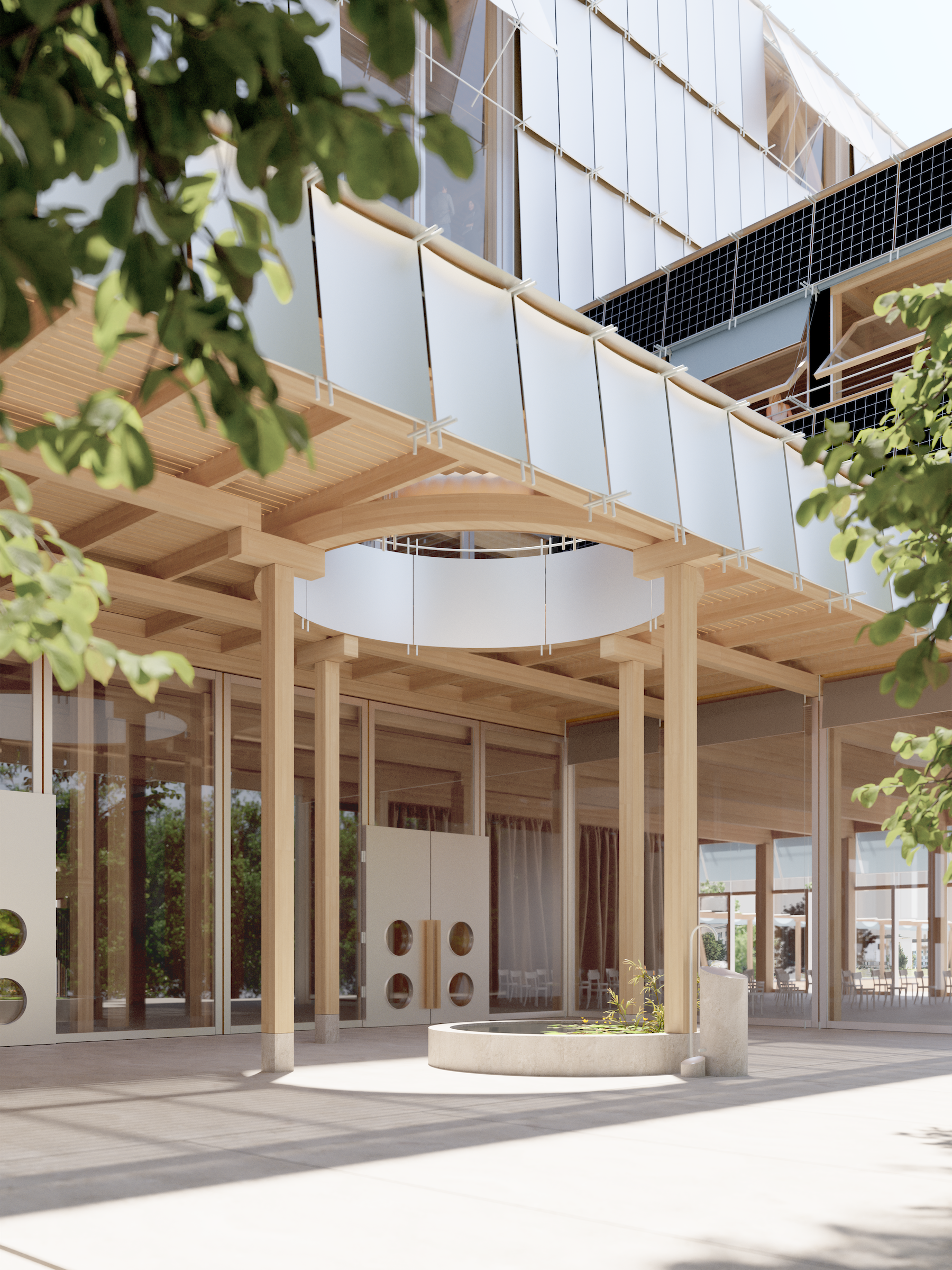 Gerahmt wird der Eingangsbereich von den drei öffentlichsten Räumen: der Bibliothek links, der Aula rechts und der Sporthalle zuoberst. Der zentrale Brunnen gliedert den Portikus in zwei Zugänge: Links führt er zur Sporthalle, rechts in die Schule. Über dem Eingangsbereich liegt der Werken-Cluster. Eine hohe Brüstung schützt diesen Bereich vor Strassenlärm. Das Dach des Portikus wird so zur Veranda und dieser Aussenraum wiederum zu einem Freiluft-Atelier – zum Hämmern, Schrauben, Sägen und Basteln.