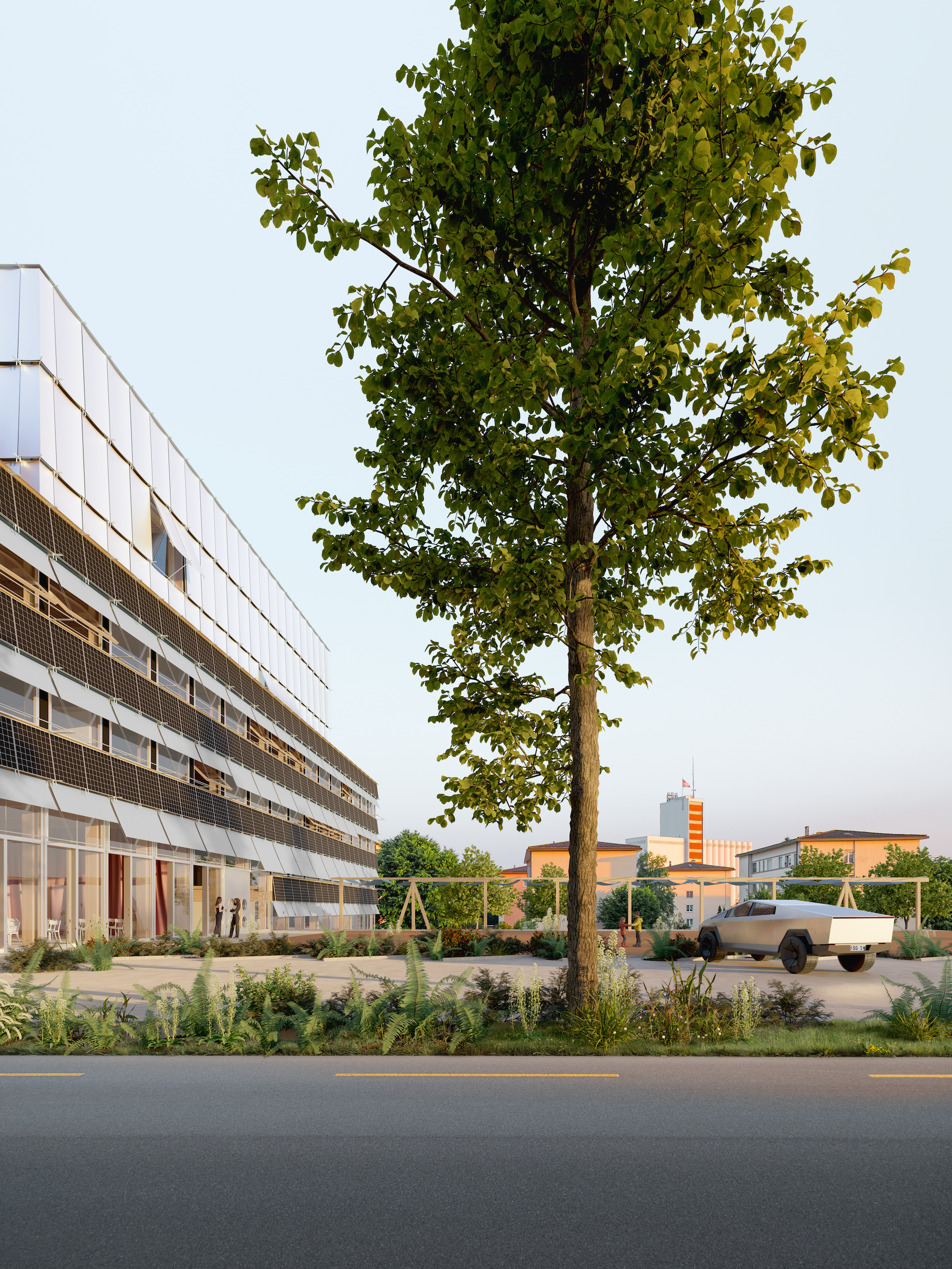 Auf massive Betonkerne wird vollständig verzichtet, stattdessen wird Beton nur dort eingesetzt, wo er konstruktiv notwendig ist: beim Fundament.