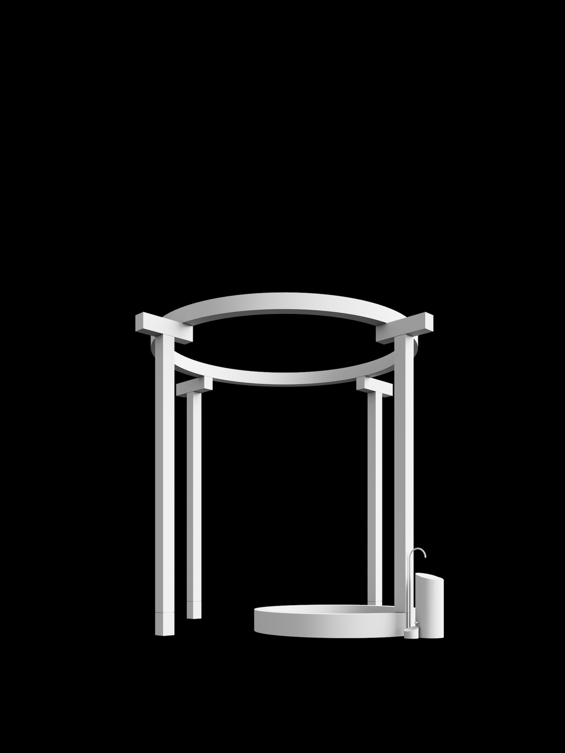 Der Brunnen wächst wie eine Skulptur aus dem Boden und bildet den Sockel der vier Stützen. Er ist so hoch, dass er zugleich als Sitzbank dient. Zwei weitere, zylinderförmige Trinkbrunnen ergänzen ihn – für Schülerinnen, Passanten und Vierbeiner.