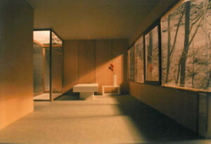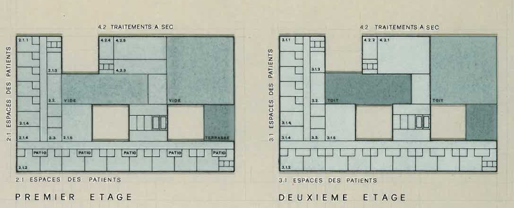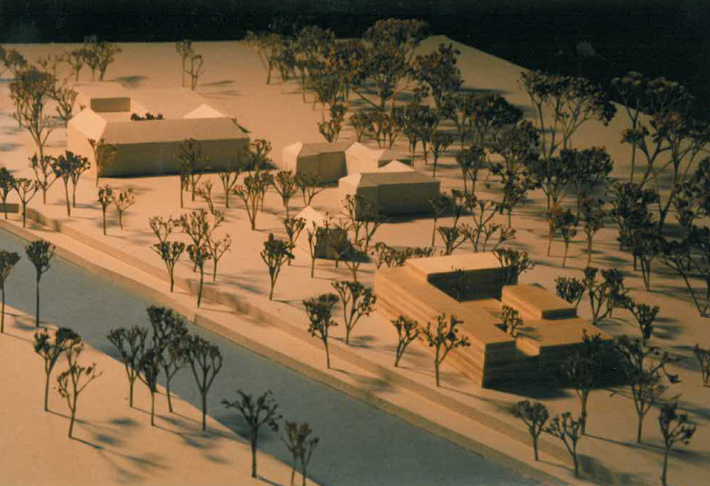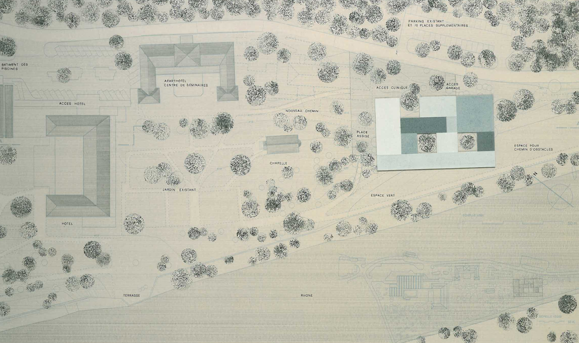 La nouvelle construction repend la géométrie des bâtiments historiques et forme la délimination spatiale de l’ensemble au sudest. Par l’ouverture au nord-est du parc sir la forêt, la clinique devient un élément autonome, resemblant à un bloc erratique et soulignant ainsi le caractère autonome de la clinique envers l’ensemble d’hôtels existants. Le bâtiment est ajouré de patios, de manière que le parc s’inscrive dans l’ensemble de la clinique. La localisation de la construction nouvelle permet soit la démolition soit la conversation de l’ancienne clinique- Si L’on conserve l’ancienne clinique, une vaste cour extérieure en découle qui s’étend vers le Rhône. La chapelle devient le centre du lieu. Des logements modestes peuvent être aménagés dans l’ancienne clinique.