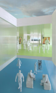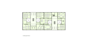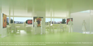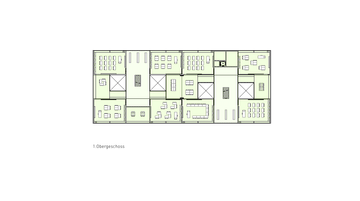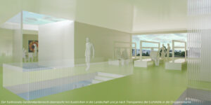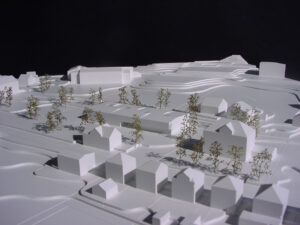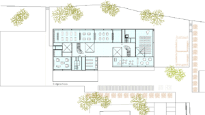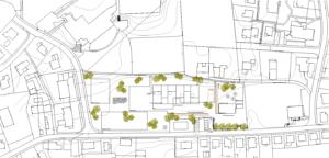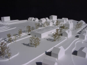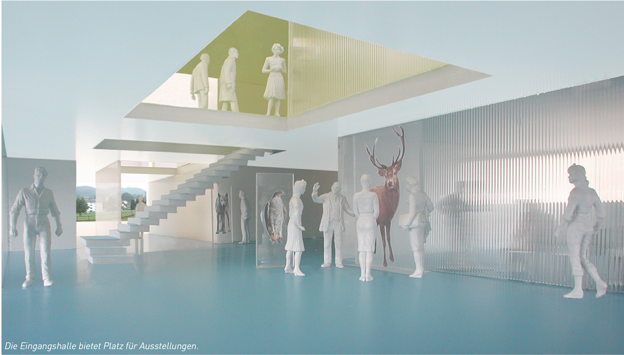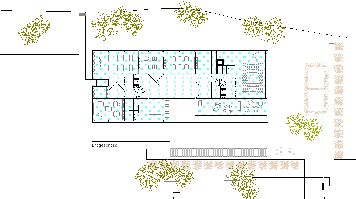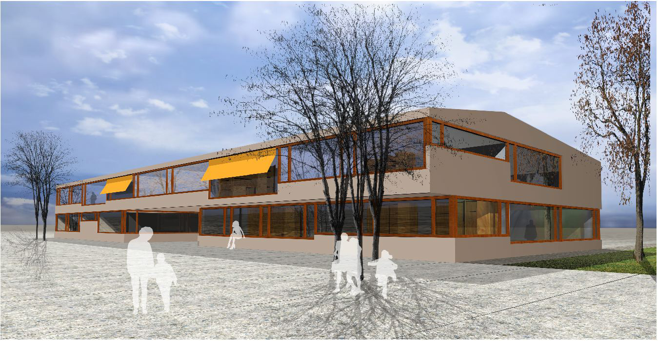 Die Lage des Baukörpers im Nordosten des Perimeters spannt zusammen mit dem bestehenden Oberstufenschulhaus über eine grosszügige Freifläche ein neues Ensemble auf und begrenzt das Schulareal gegen Südosten. Der flächige Neubau reagiert auf die bestehenden grossmassstäblichen Wohn- und Industriebauten der näheren Umgebung und führt über die eingeführte Faltung der Dachfläche in das kleinkörnige Bebauungsmuster entlang der Neugasse über. Diese Positionierung des Neubaus und seine parallele Ausrichtung zum Perimeter generieren im Westen eine grosse Freilandreseve, die auf längere Sicht optimale Voraussetzungen für zusammenhängende Erweiterungsmöglichkeiten bietet oder der Gemeinde als Freilandreserve für weitere öffentliche Gebäude zur Verfügung steht.