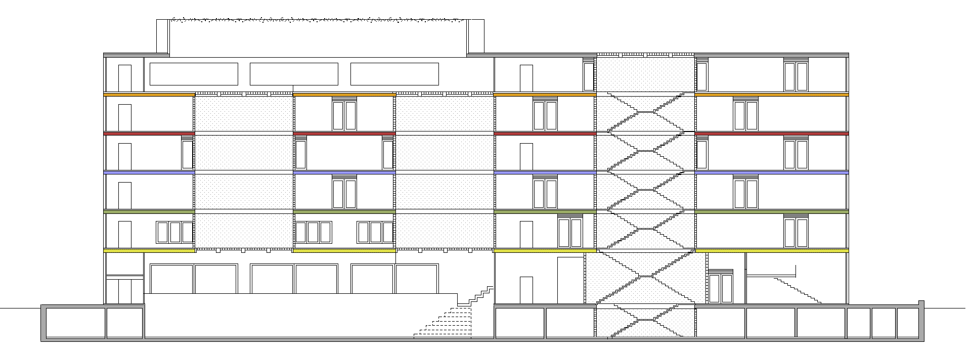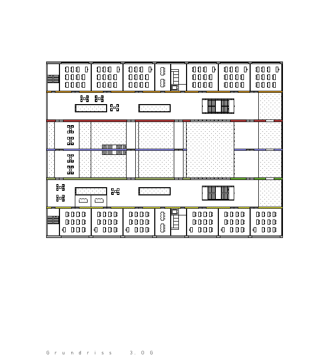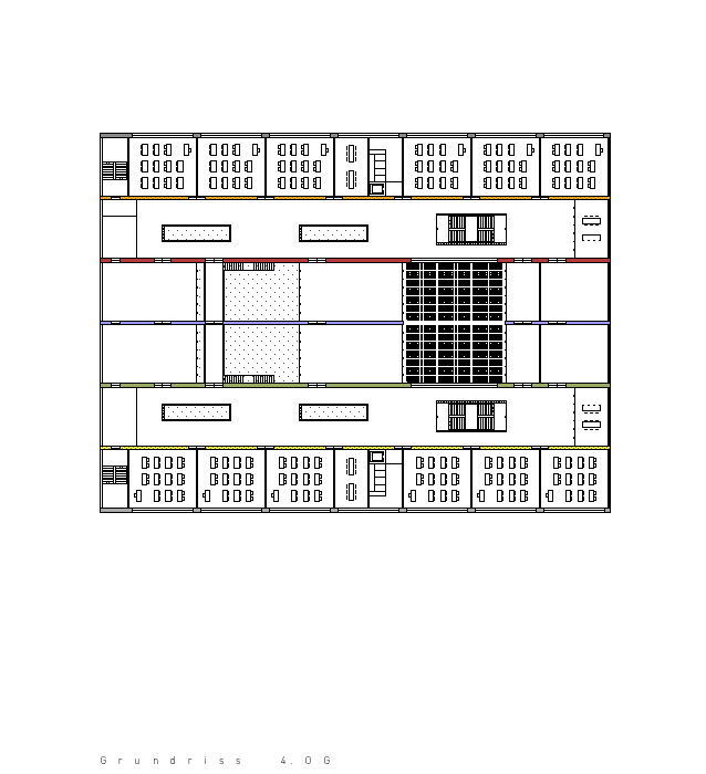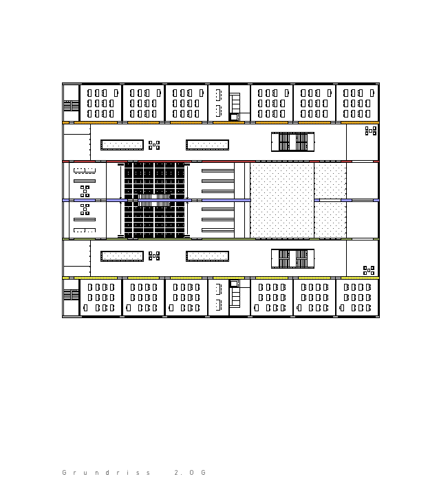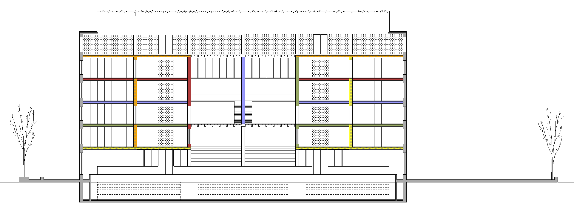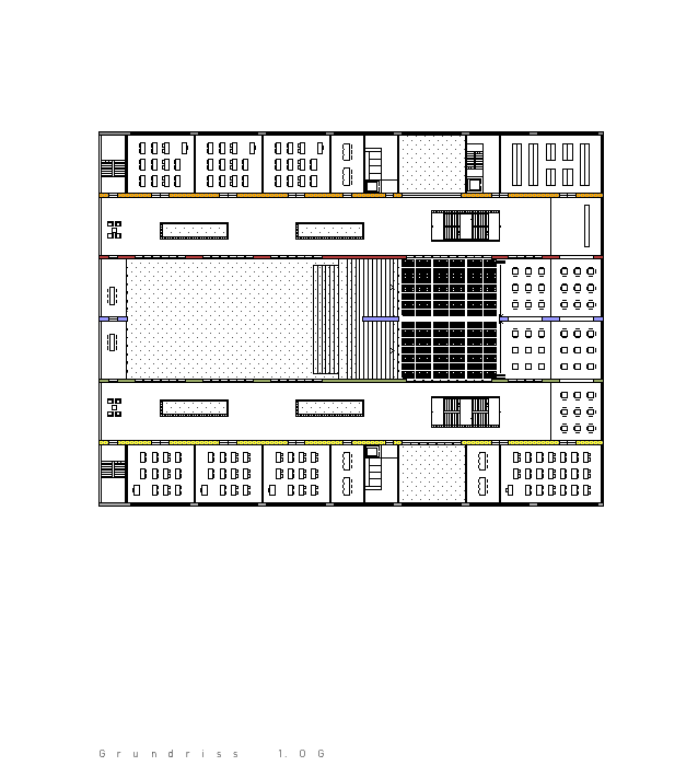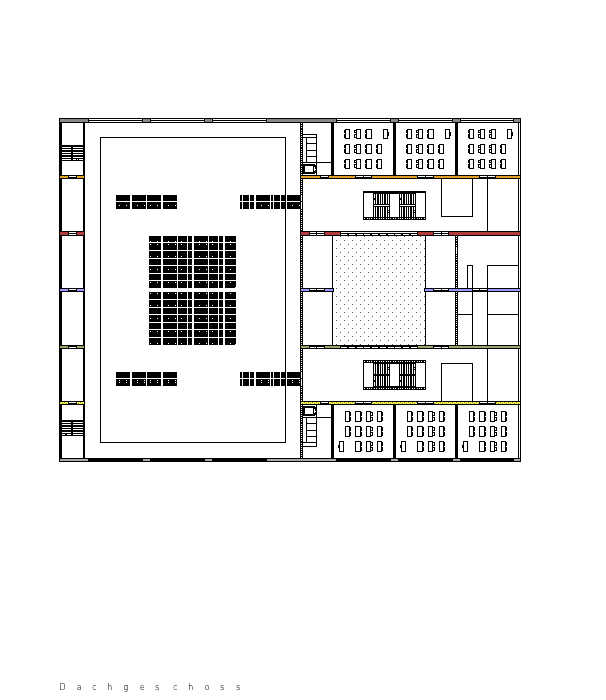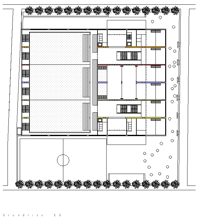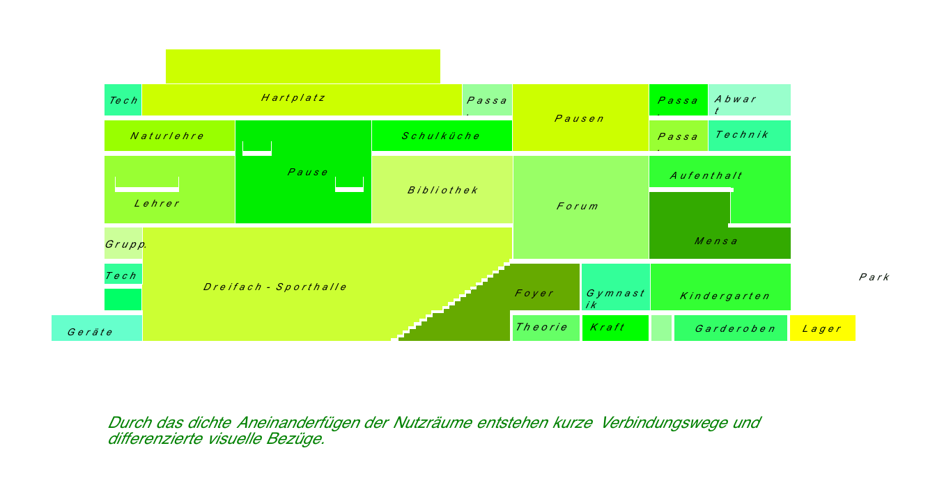 Die ganze Schulanlage ist in einem Gebäudevolumen auf dem Baufeld B5 konzentriert. Das Projekt hält sich eng an die ‚Richtlinien Zentrum Zürich Nord‘, indem die Ecken und Ränder des Baufeldes voll besetzt sind und so der Strassenraum ringsum definiert wird. Der Über- gang vom ‚Örliker-‚ zum ‚Friedrich Traugott Wahlen-Park‘ wird dank der Gebäudehöhe des neuen Schulhauses als kontinuierlicher, urbaner Freiraum gelesen. Die Räume der Primar- und der Ober- stufe sowie ihre jeweiligen Pausen- flächen und Erschliessungen sind räumlich konsequent voneinander getrennt. Die Schüler und Schülerin- nen haben aber im ganzen Gebäude immer wieder visuellen Kontakt. Im mittleren Teil der dreischichtigen Anlage – von beiden ‚Schulen‘ zugänglich – sind die unter Aufsicht gemeinsam genutzten Räume wie Mensa und Forum angeordnet. Indem die Primar- und Oberstufe in einem Gebäude konzentriert sind, werden die sozialen Beziehungen der Kinder und auch der Unter- richtenden gefördert. Unterricht und Erfahrungsaustausch sollen in der modernen Schulpädagogik nicht nur im Klassenzimmer stattfinden.