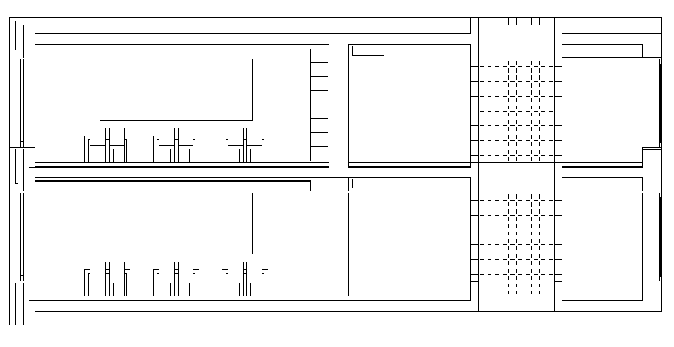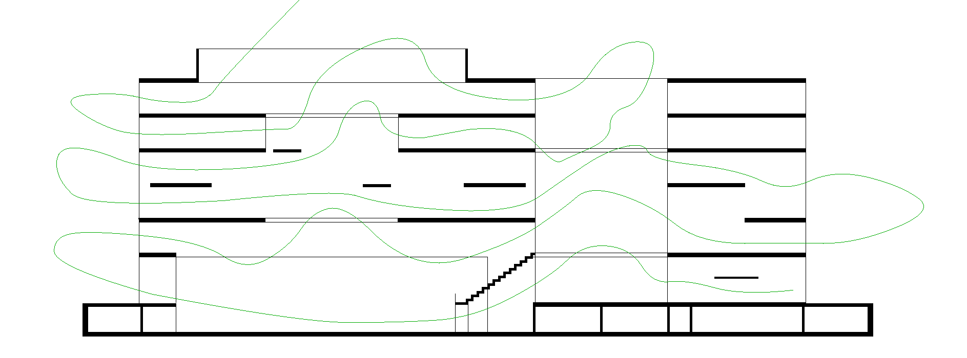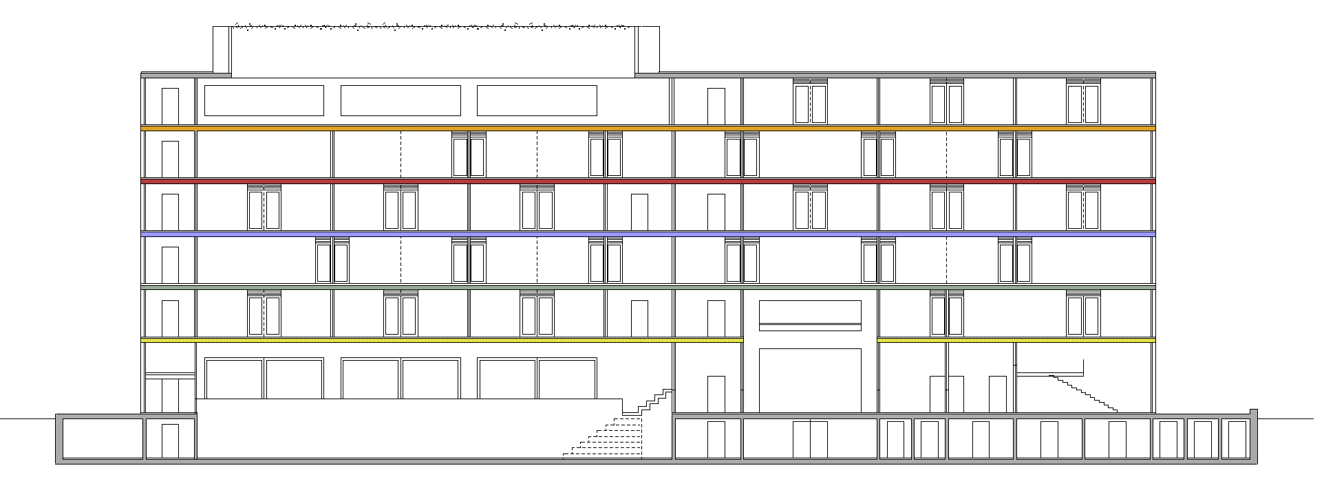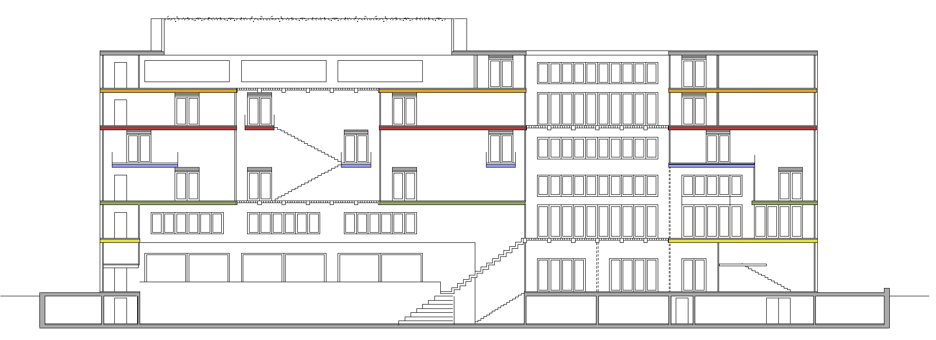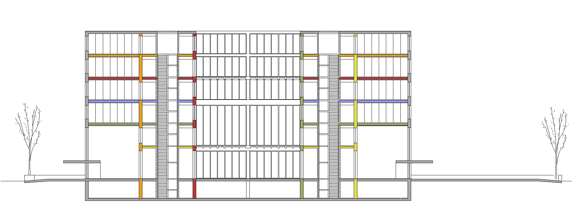 Die ganze Schulanlage ist in einem Gebäudevolumen auf dem Baufeld B5 konzentriert. Das Projekt hält sich eng an die ‚Richtlinien Zentrum Zürich Nord‘, indem die Ecken und Ränder des Baufeldes voll besetzt sind und so der Strassenraum ringsum definiert wird. Der Über- gang vom ‚Örliker-‚ zum ‚Friedrich Traugott Wahlen-Park‘ wird dank der Gebäudehöhe des neuen Schulhauses als kontinuierlicher, urbaner Freiraum gelesen. Die Räume der Primar- und der Ober- stufe sowie ihre jeweiligen Pausen- flächen und Erschliessungen sind räumlich konsequent voneinander getrennt. Die Schüler und Schülerin- nen haben aber im ganzen Gebäude immer wieder visuellen Kontakt. Im mittleren Teil der dreischichtigen Anlage – von beiden ‚Schulen‘ zugänglich – sind die unter Aufsicht gemeinsam genutzten Räume wie Mensa und Forum angeordnet. Indem die Primar- und Oberstufe in einem Gebäude konzentriert sind, werden die sozialen Beziehungen der Kinder und auch der Unter- richtenden gefördert. Unterricht und Erfahrungsaustausch sollen in der modernen Schulpädagogik nicht nur im Klassenzimmer stattfinden.