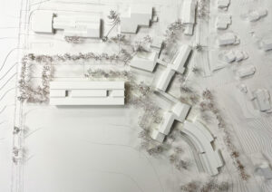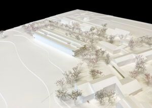 Der Entwurf für den Neubau der Sekundarschule Stadel mit Doppelturnhalle bildet aufgrund der engen Grundstücksverhältnisse ein langes, freistehendes Gebäude entlang der Landwirtschaftszone und gliedert den Aussenraum in drei klar definierte Freiraumkammern, wobei die bestehenden Wege erhalten bleiben.
