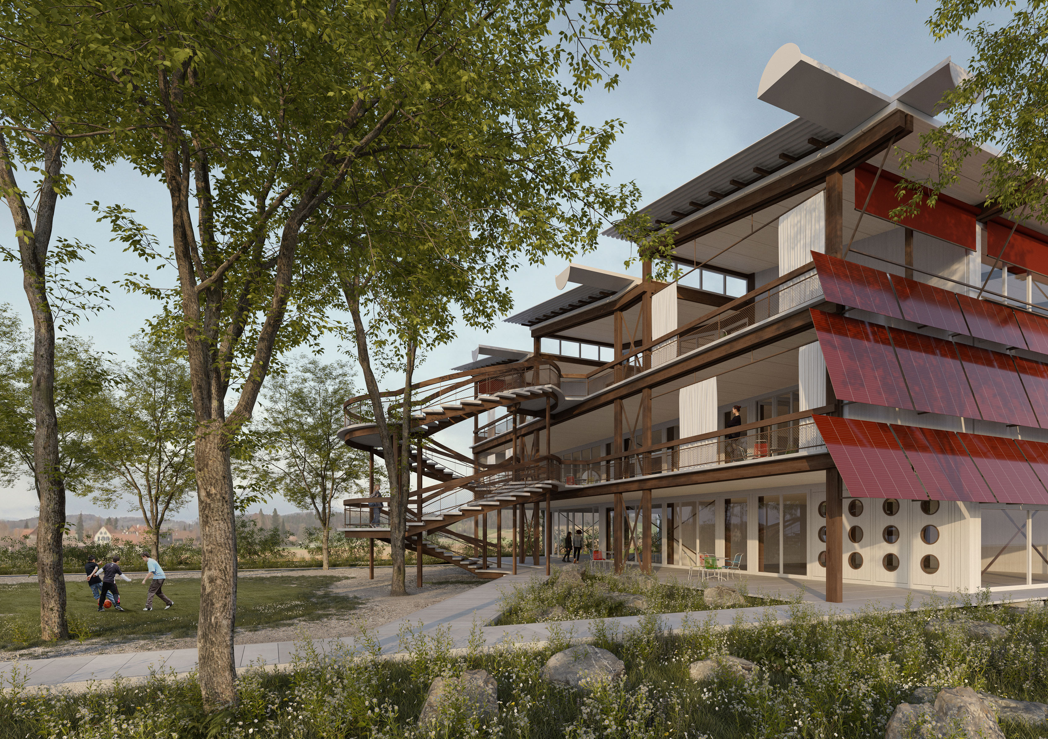 Nachhaltigkeit wird durch energieeffiziente Bauweise, Holzskelettbau, Photovoltaikanlage, Nutzung erneuerbarer Energien, minimierten Tiefbau und Regenwassermanagement gewährleistet. Das Gebäude verfolgt das Ziel einer klimapositive Architektur, die ökologisch, sozial und pädagogisch zukunftsgerichtet ist.