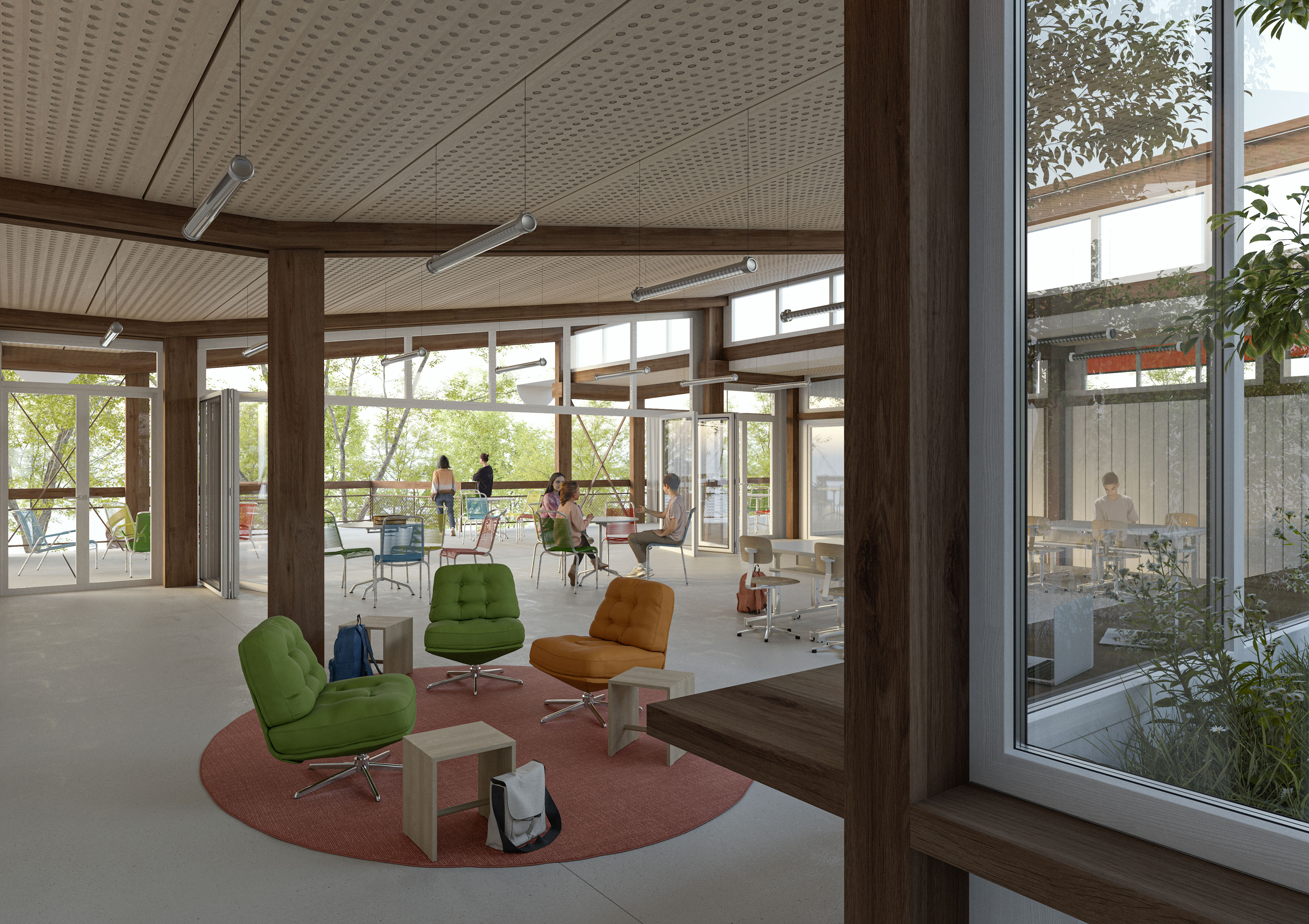 Der Zugang erfolgt über die großzügige Laube an den offenen Stirnseiten, die zugleich Erschließung, Aufenthaltsbereich und Aussenklassenzimmer bildet. Zwei Patios durchbrechen das zentrale Sheddach, dienen als Orientierungspunkte und schaffen Blickbeziehungen. Alle Unterrichtszimmer liegen im Obergeschoss, verbunden durch Korridore und Flexzonen, die kurze Wege, offene Lernlandschaften und vielfältige Nutzungsmöglichkeiten ermöglichen. Terrassen an den Stirnseiten verschmelzen Innen- und Aussenbereich und erweitern die Lernumgebung.