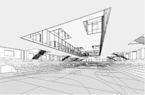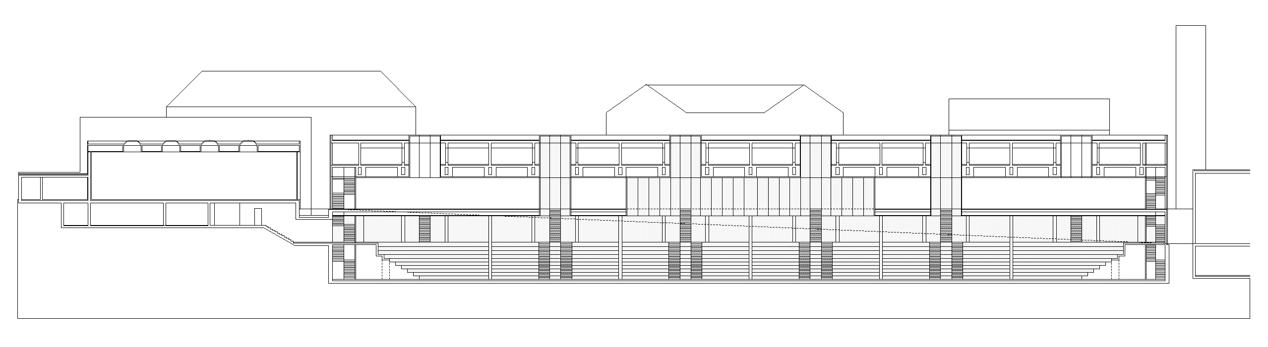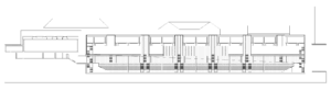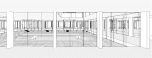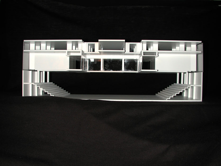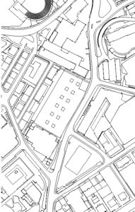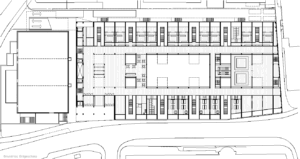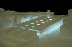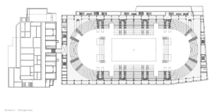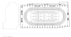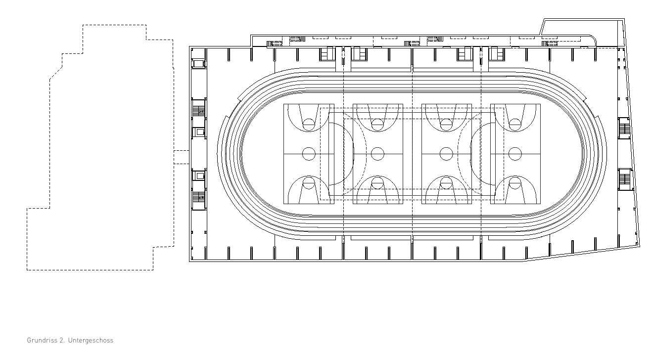 Durch die Synergie von Nutzungsanordnung im Schnitt und innovativer Tragstruktur wird es möglich, die Vorgaben des Programms städtebaulich optimal auf dem engen Perimeter unter- zubringen. Die minimierte Gebäude- höhe nimmt in höchstem Masse Rücksicht auf das Bürgliquartier und die Abtrennung des Baukörpers von der bestehenden Dreifachturnhalle macht den neuen Bau als klar begrenztes Volumen im städtischen Umfeld erkennbar. Da durch kann eine hohe Verträglichkeit des Volumens im städtischen Gefüge erreicht werden.