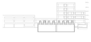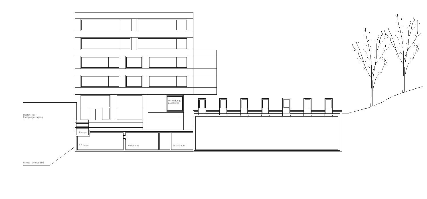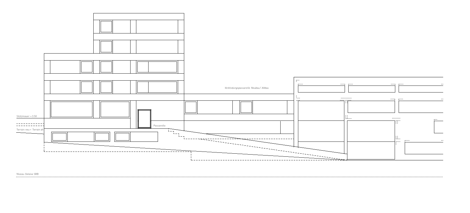 zu korrigieren. Durch die Platzierung des Mehrzweckraumes auf dem Niveau der Fussgänger- passarelle wird der Pausenbereich belebt und über das vorgelagerte Foyer erhält der Sportbereich einen leicht auffindbaren zentralen Zugang. Der Neubau wird sowohl über das Untergeschoss als auch über das Erd- und 1. Obergeschoss mit dem bestehen- den Altbau verbunden. Dies geschieht über eine einzige Treppenanlage mit Lift , die zentral den Kern des Entwurfs bildet. Darum herum sind die zweiseitig belichteten Klassen-