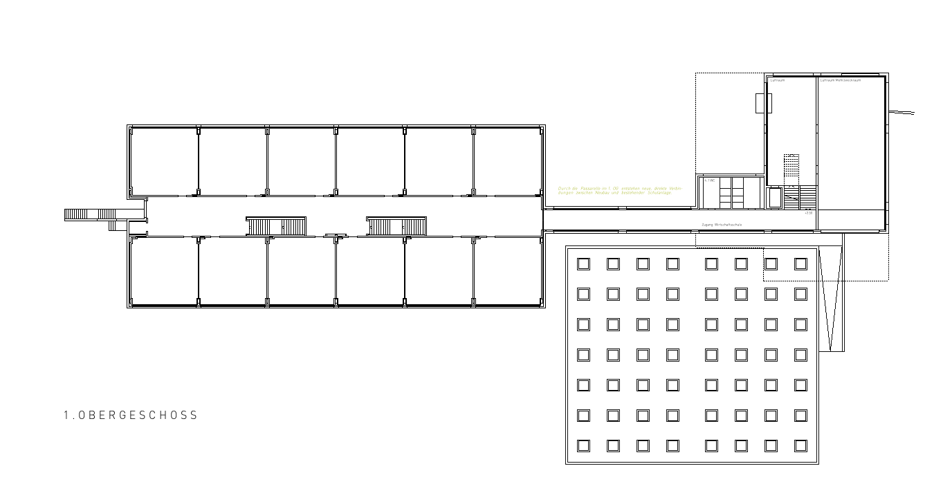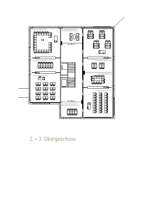 zimmer und die Nebenräume so angeordnet, dass eine maximale Flexibilität erreicht werden kann, die sogar soweit geht, dass neben den verlangten Räumen zwei zusätzliche Schulzimmer realisiert werden könnten. Der Weg zwischen den Geschossen einerseits und den beiden Baukörpern andererseits wird so zur ‚promenade architecturale‘.