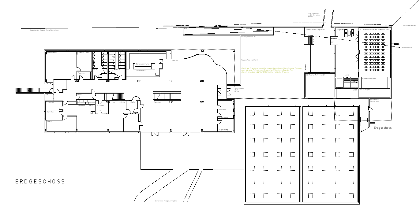 Der Neubau versucht die funktionalen Nachteile des bestehenden Schulhauses (umständliche Erschliessung des Sportbereiches, ungenügende Aktivierung des Pausenplatzes)