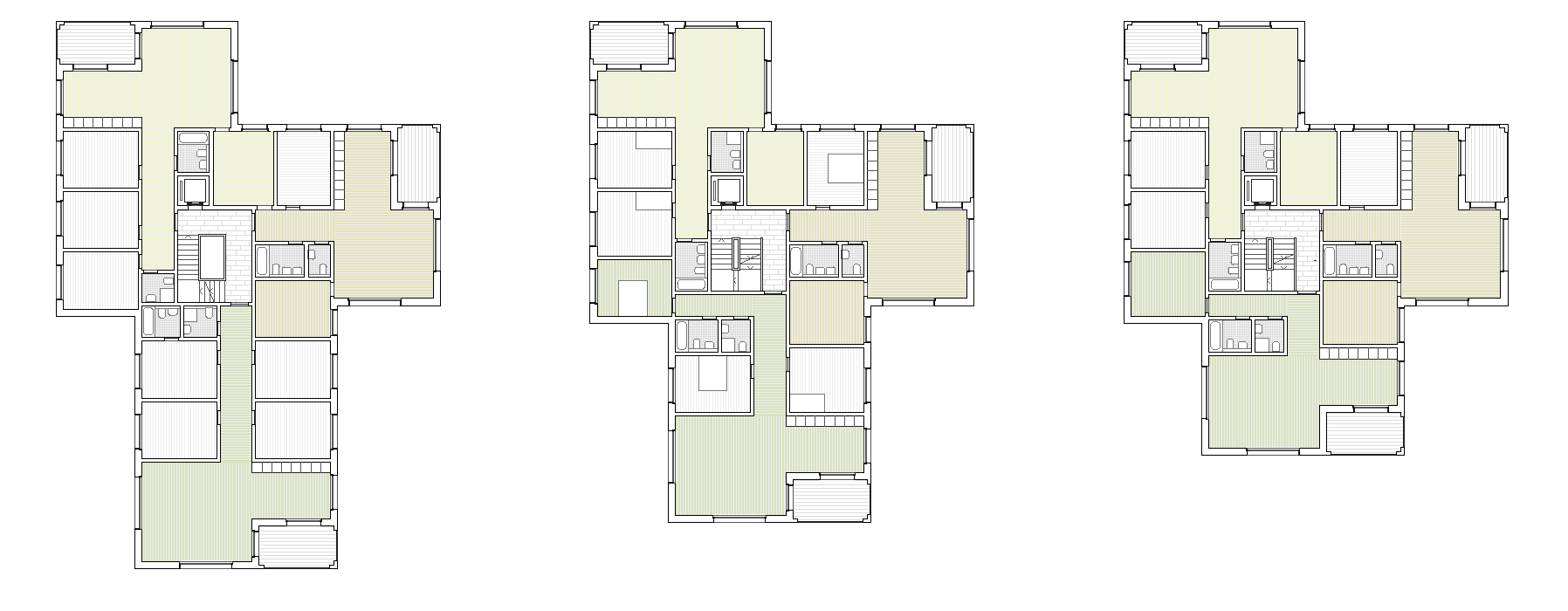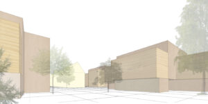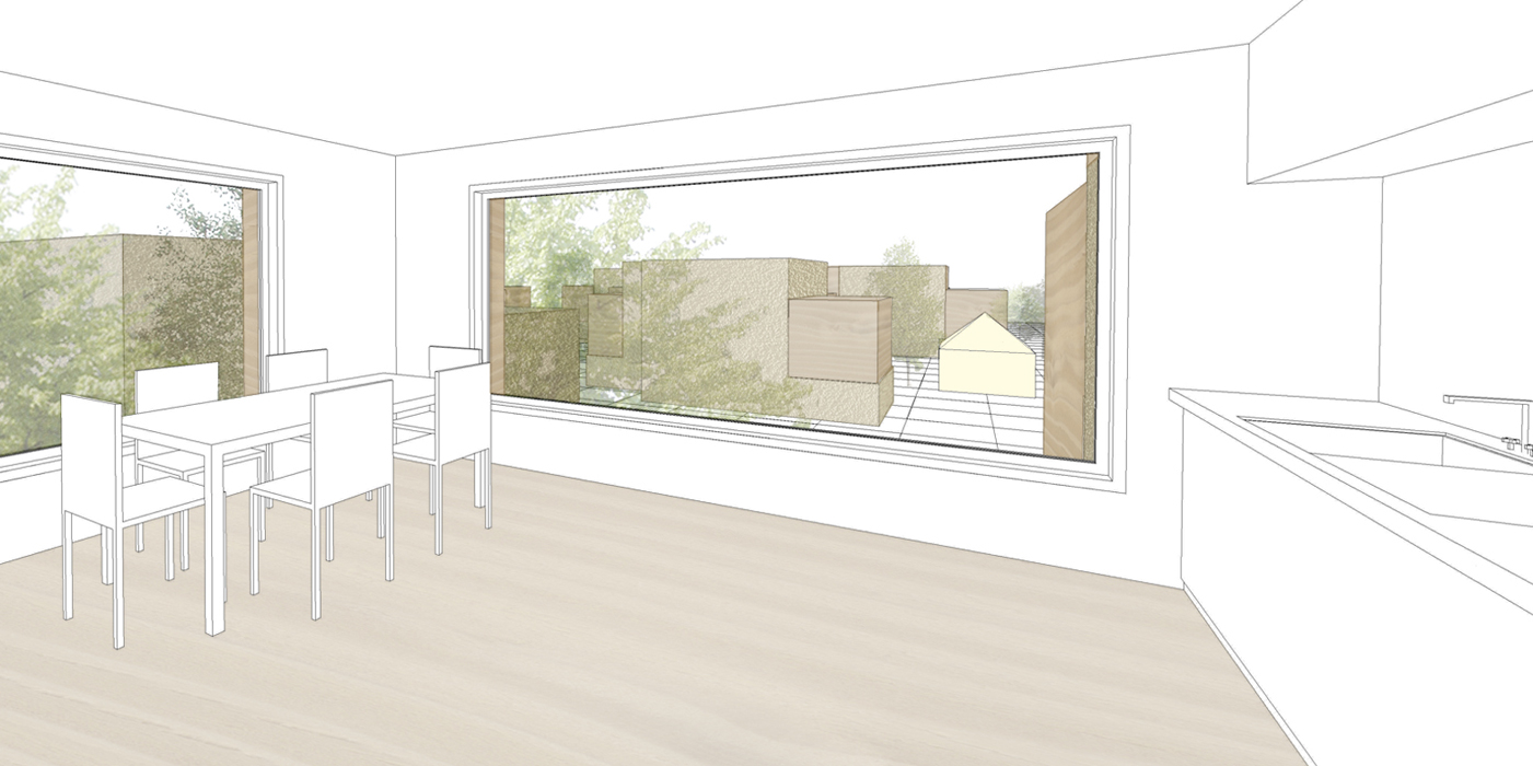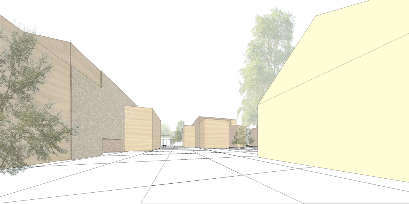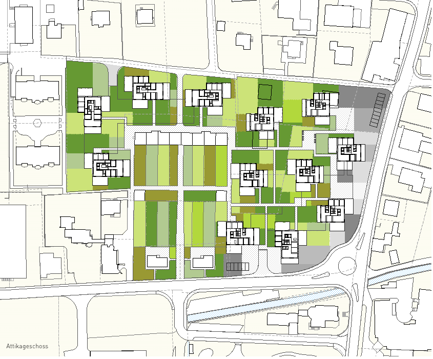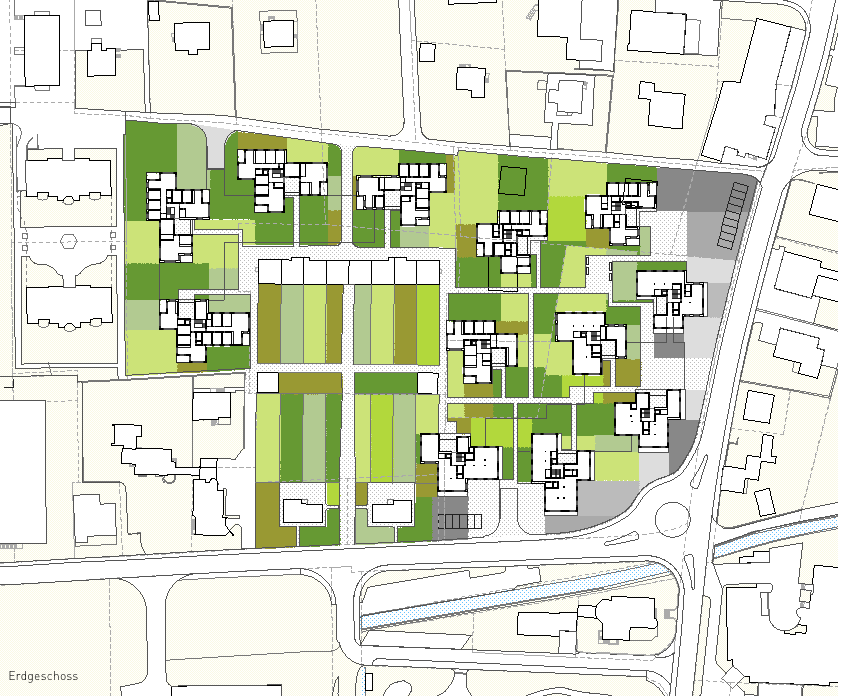 Die bestehenden Wohnhäuser der Wohnkolonie ‚Daheim‘ charakterisieren den Ort. Durch die Gegenüberstellung eines länglichen Baukörpers und zweier frei stehenden 2-Familienhäuser spannt sich ein Feld auf. Eine Besetzung dieses Gartens durch Wohnbauten würde den Grundgedanken dieser Anlage in Frage stellen. Unserer Meinung nach ist diese freie Mitte ein grosses Potential dieser Wohnsiedlung; Neubauten sollten sich an diesem orientieren. Der Situationsplan der Architekten Meili & Wapf aus dem Jahre 1919 weist bereits auf eine spätere Erweiterungsmöglichkeit hin. Durch vier Baukörper würde die Gartenanlage auf den Seiten flankiert. Unser Projektvorschlag orientiert sich an diesem historischen Plan. Die Neubauten werden an den Rand der Gartenanlage gestellt, wodurch diese für die gesamte Siedlung als zentraler Ort erhalten bleibt.